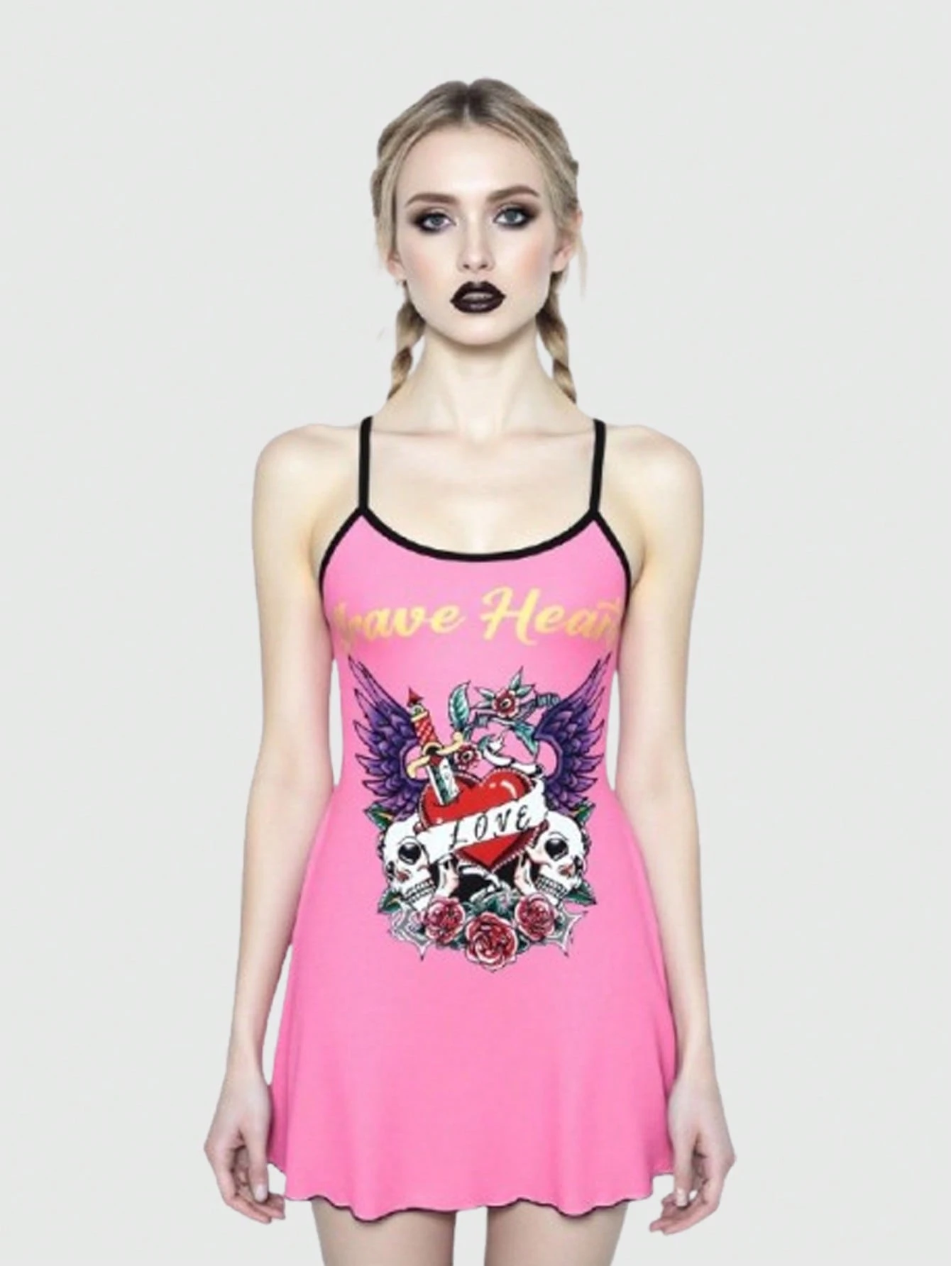 J-Fashion Vintage Heart Ribbon, Skull Wing, Rose & Vine Print Sleeveless Summer Casual Dress For Women