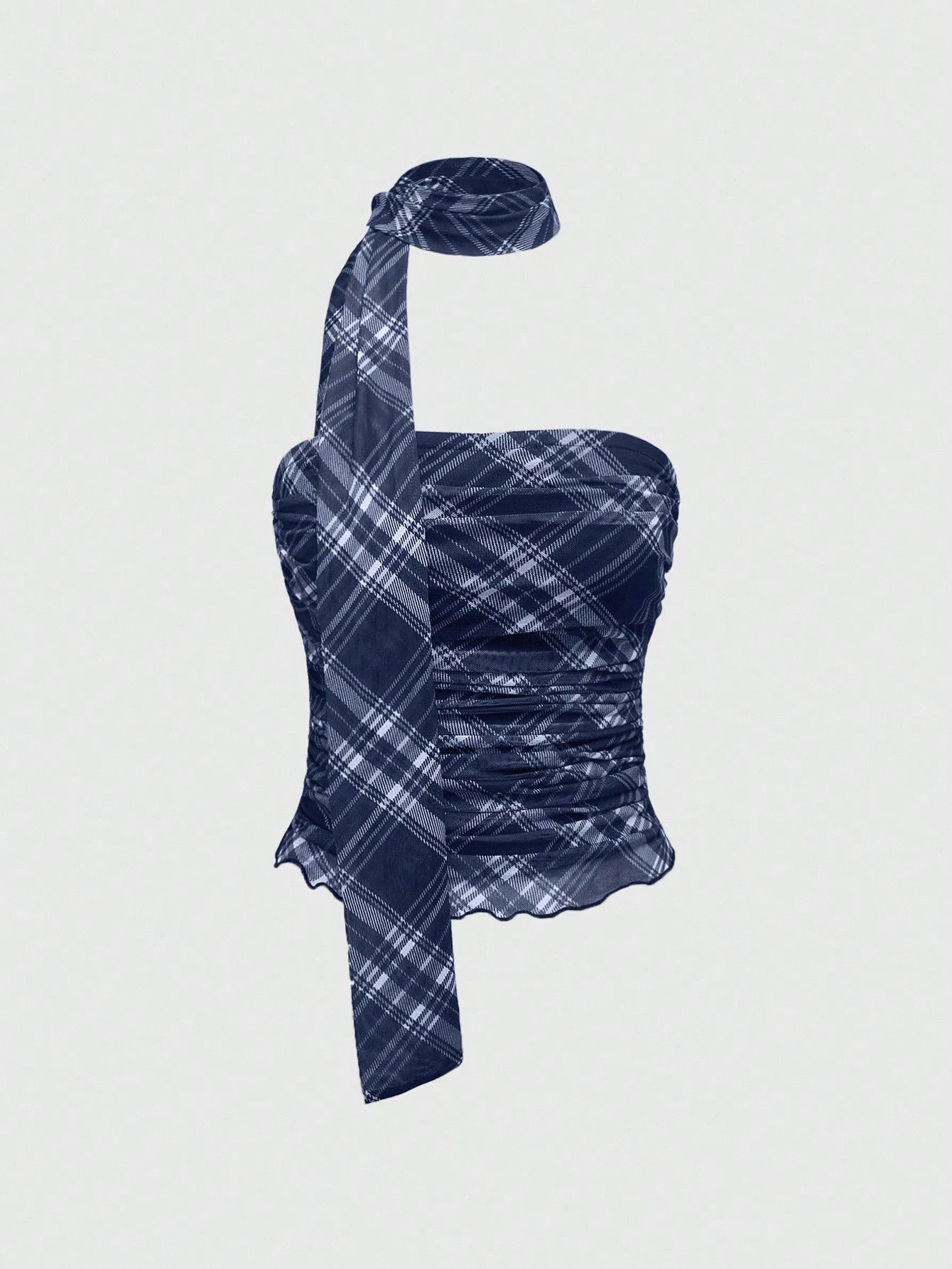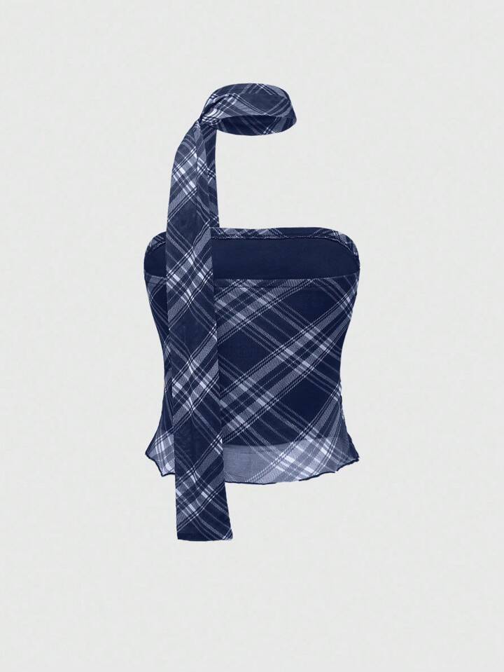 J-Fashion Women's Back To School American Preppy Plaid Halter Neck Tank Top (With Scarf)