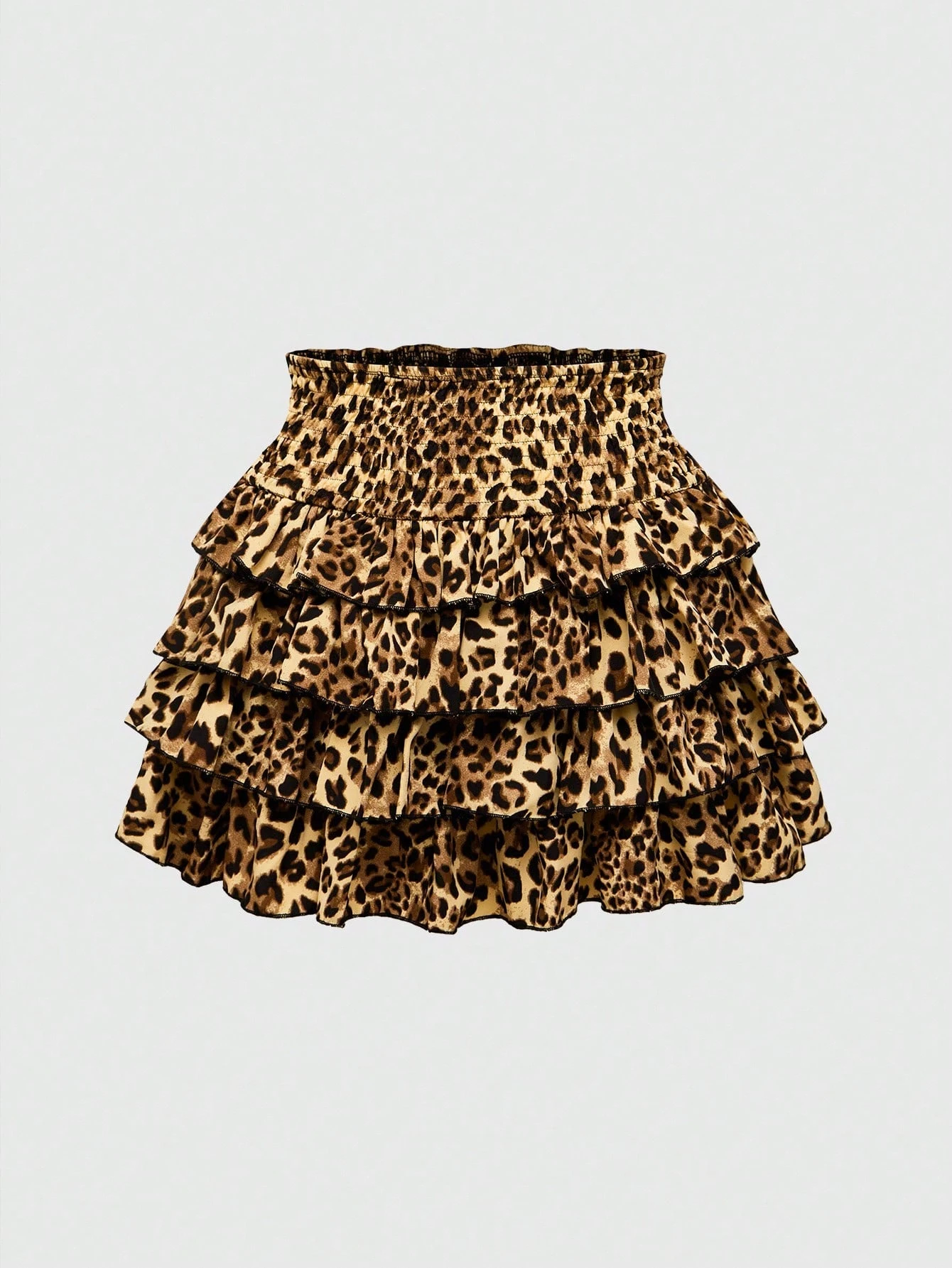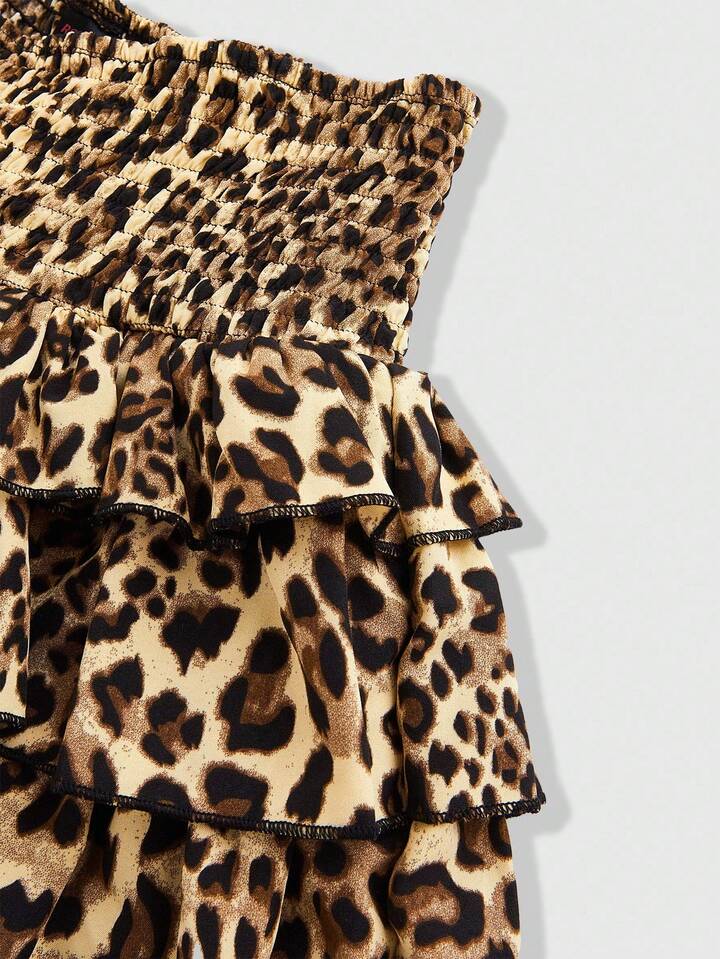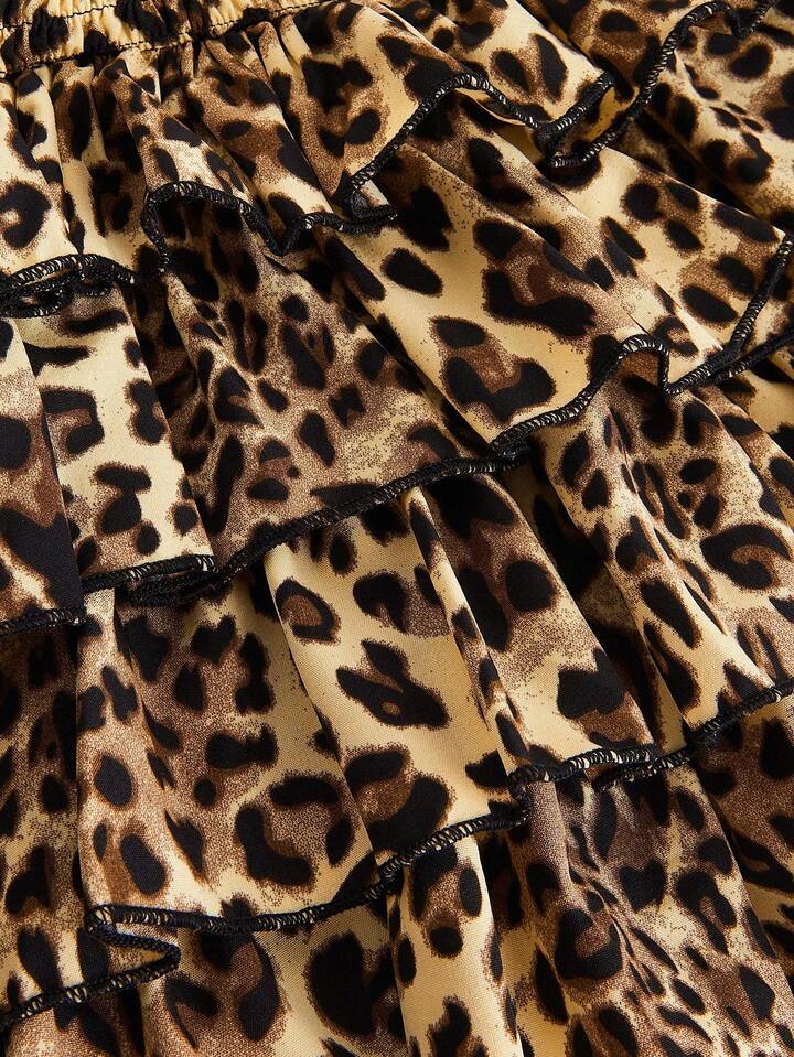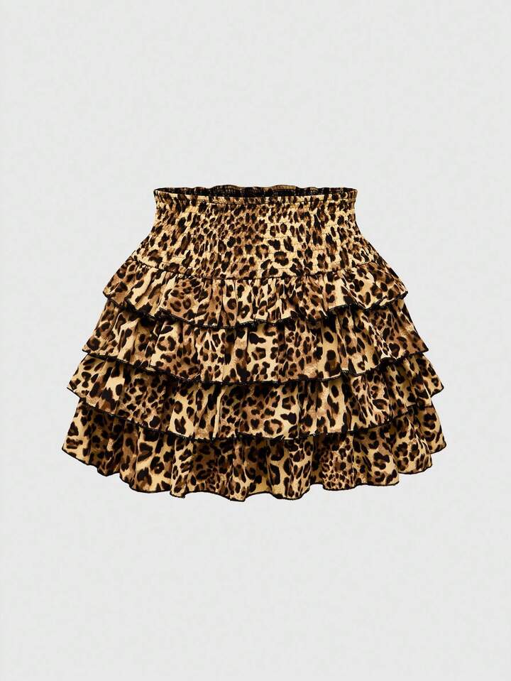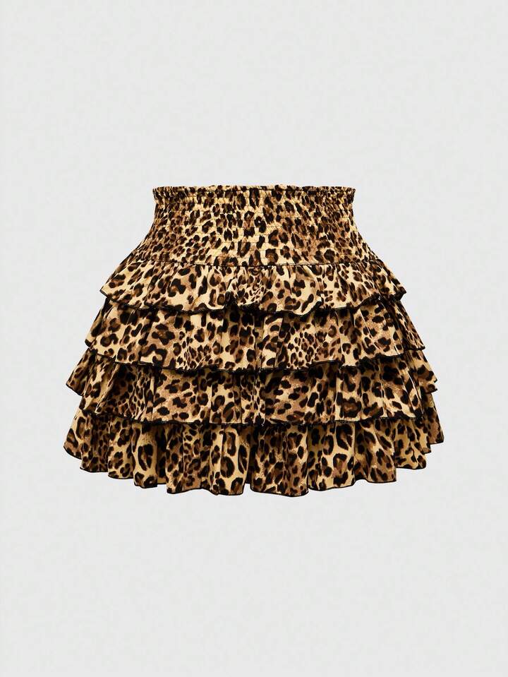 J-Fashion Women's Casual Chic Street Fashion Leopard Print Cinched Waist Layered Ruffle Hem Mini Skirt, Summer