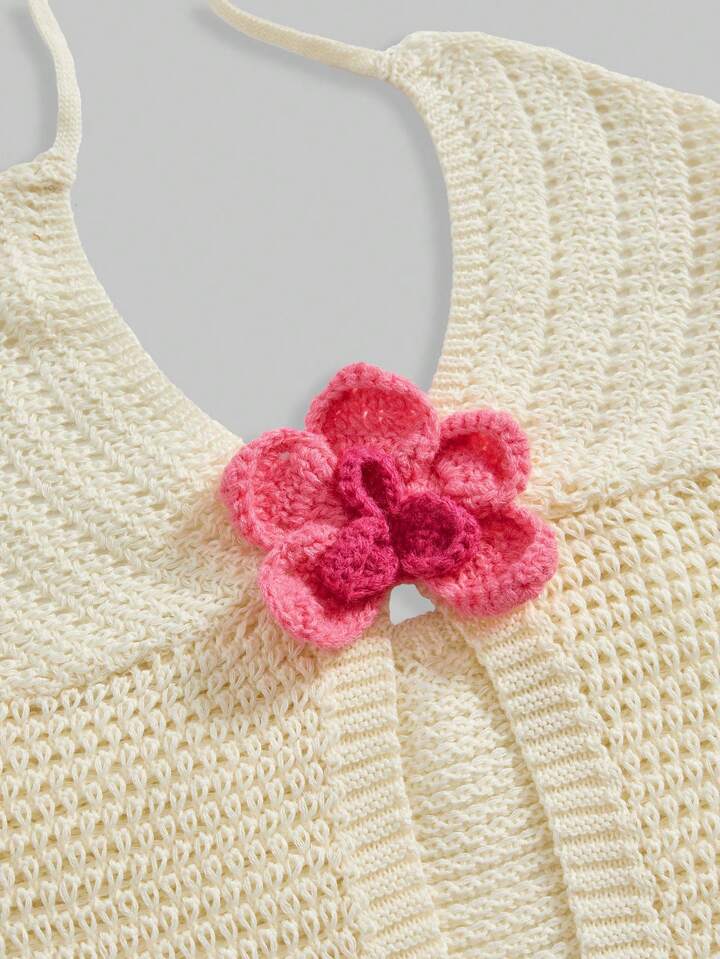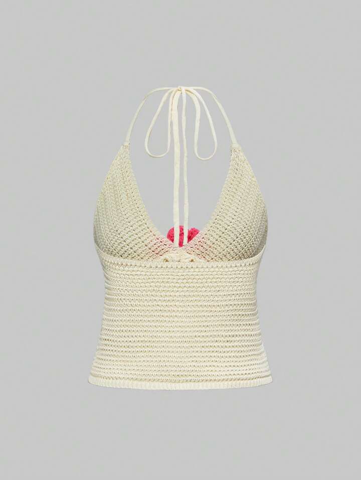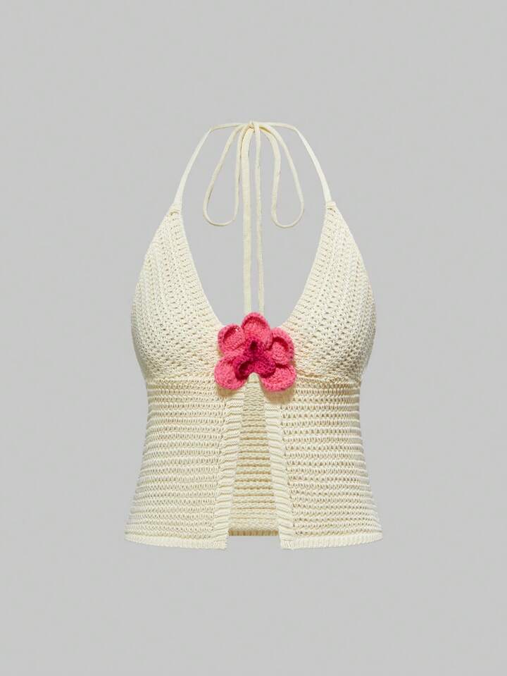 J-Fashion Women's Contrast Floral Hollow Out Halter Neck Knitted Cropped Top With Slit, Creamy Yellow