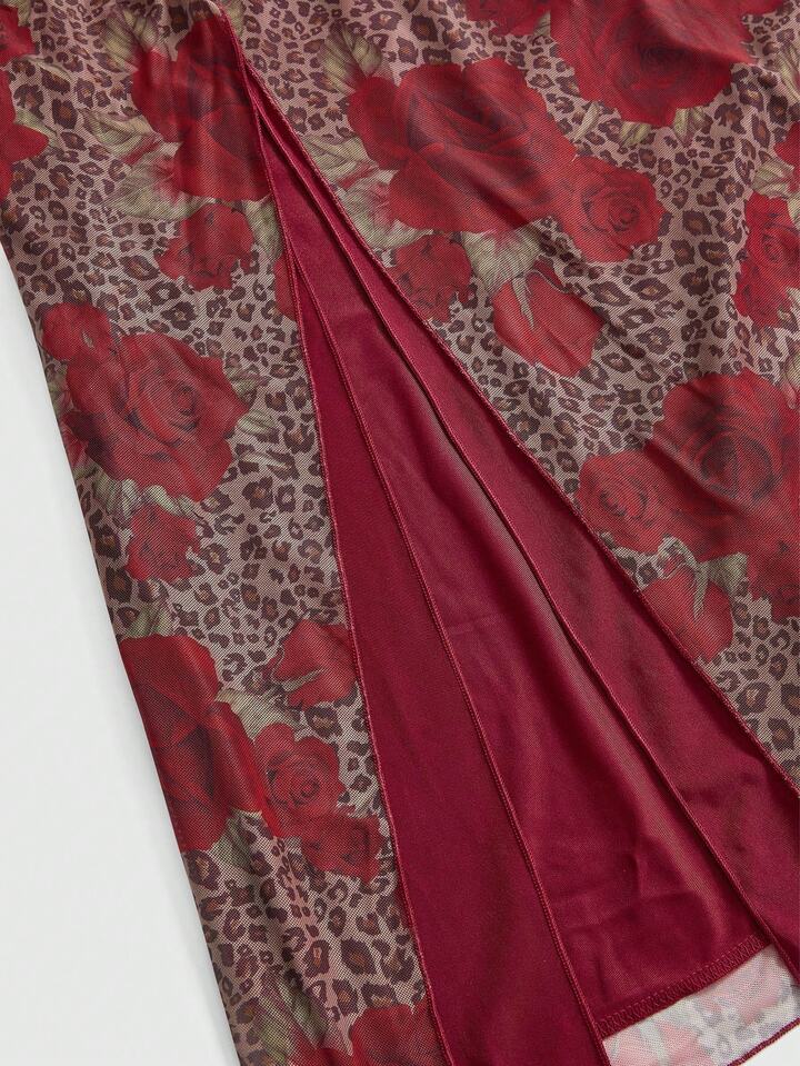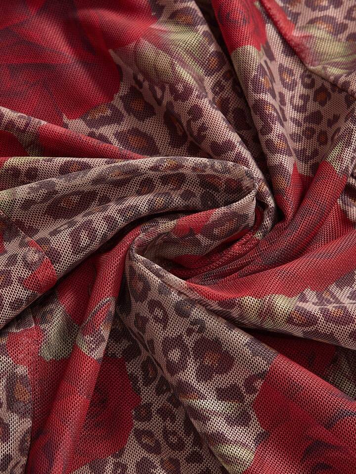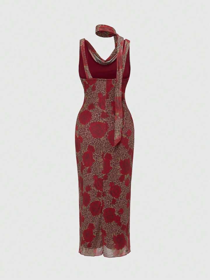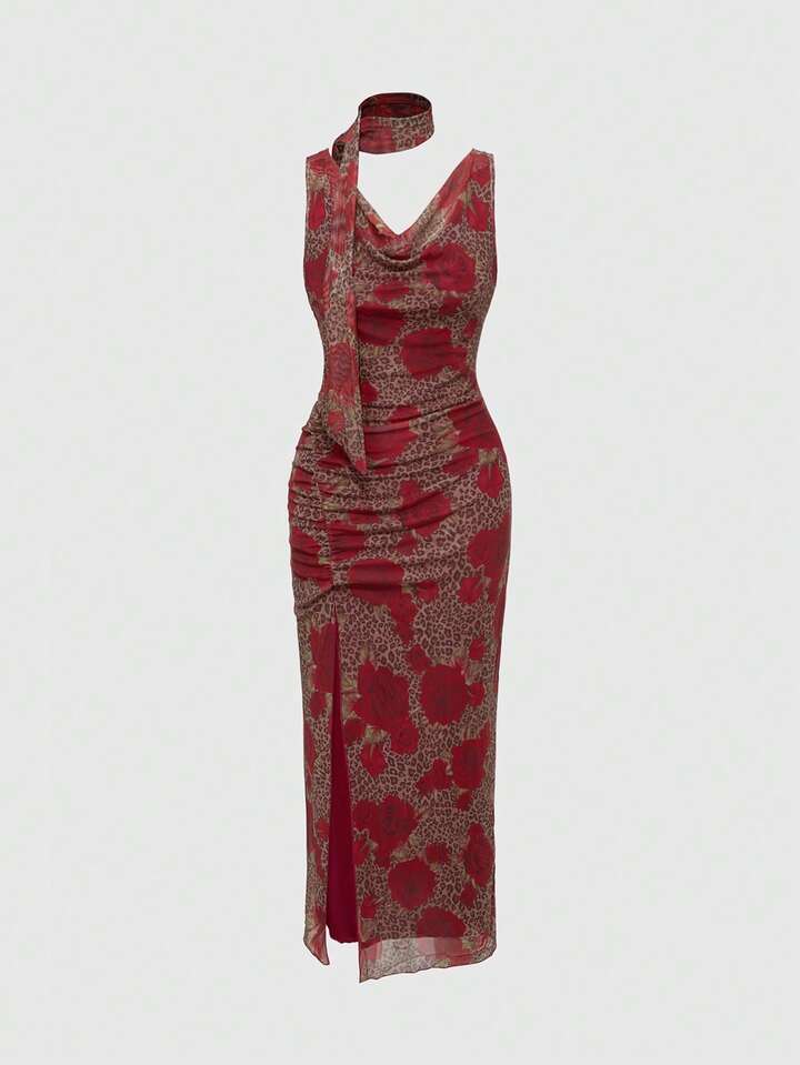 J-Fashion Women's Draped Neck Sleeveless Fitted Ruched Floral & Leopard Print Midi Dress