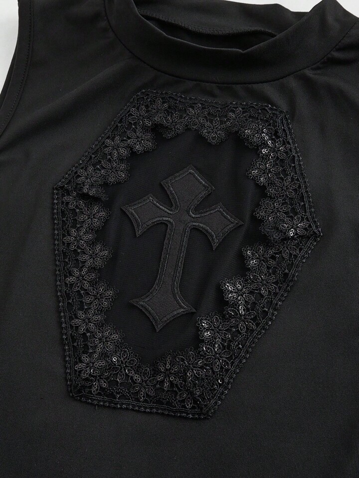 J-Fashion Women's Fashionable Hollow Out Embroidered Cross Collared Tank Top
