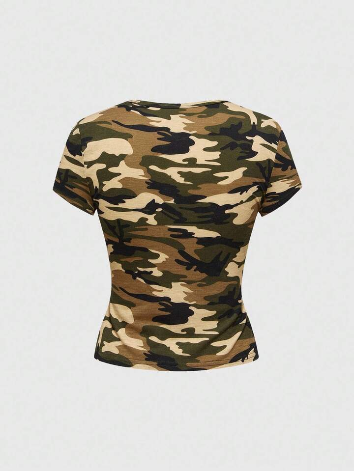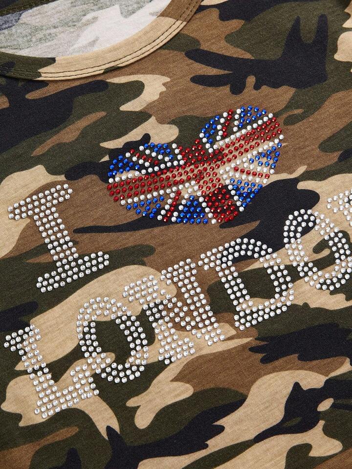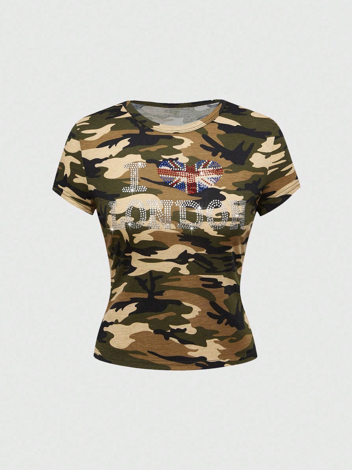 J-Fashion Y2K Baddie Abby Flag & English Rhinestone Camo Print Tight Fit Women T-Shirt