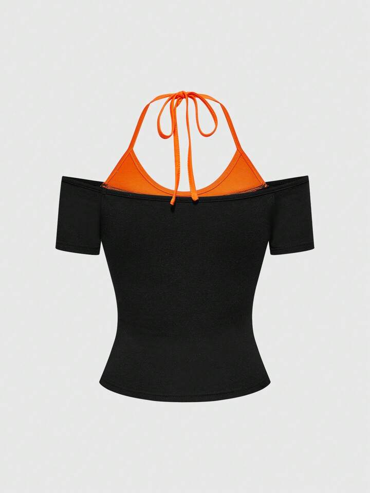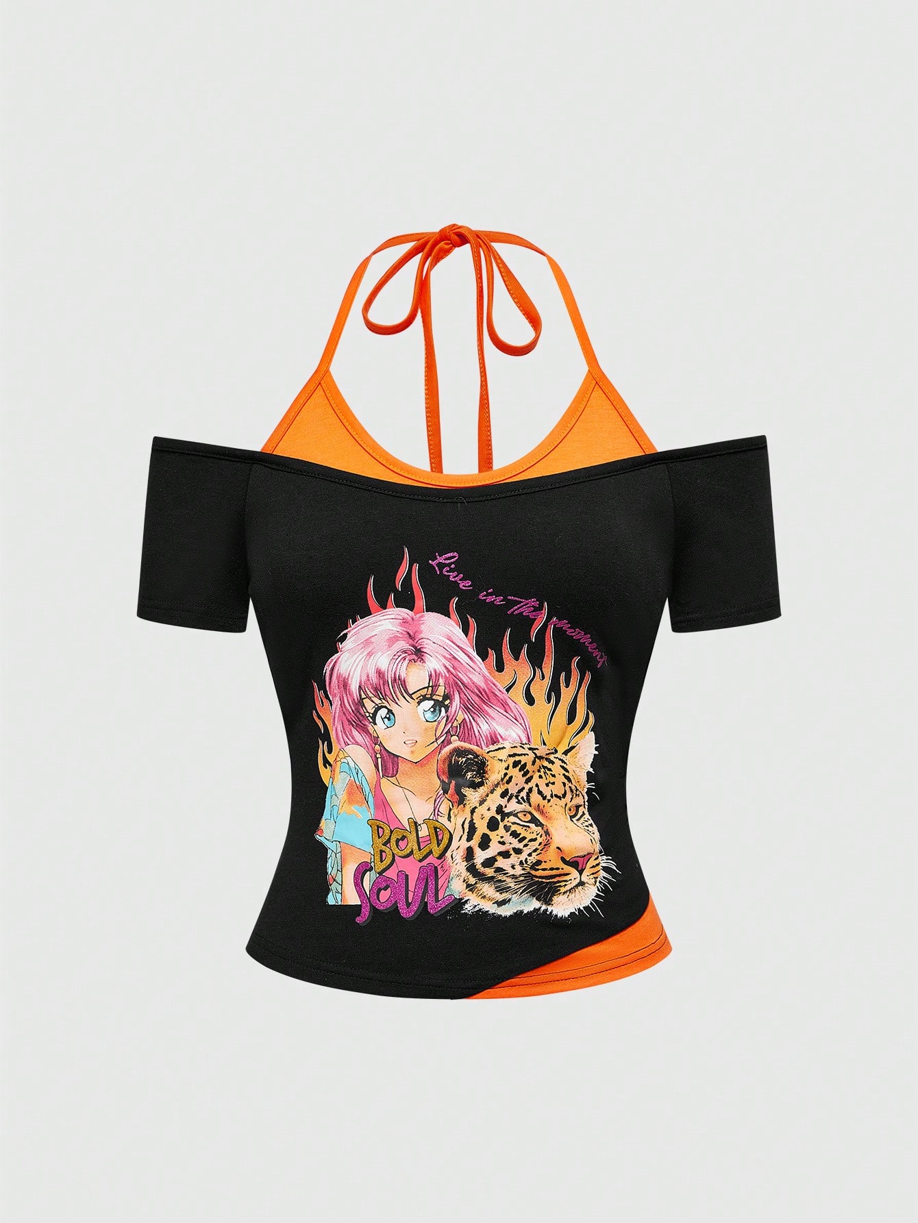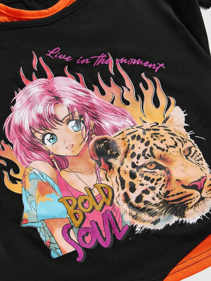 J-Fashion Y2K Cartoon Girl & Tiger Splicing Crew Neck T-Shirt