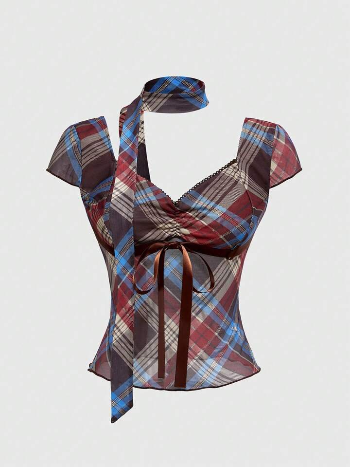 J-Fashion Y2K Cute Plaid Scarf Accent Sweetheart Neck Short Sleeve T-Shirt For Women