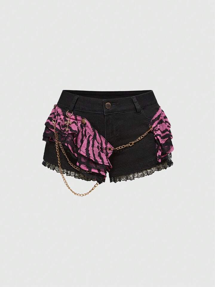 J-Fashion Y2K Harajuku Himekaji Gyaru Abby Colorful Zebra Stripe & Cross Chain Decor Women Denim Shorts