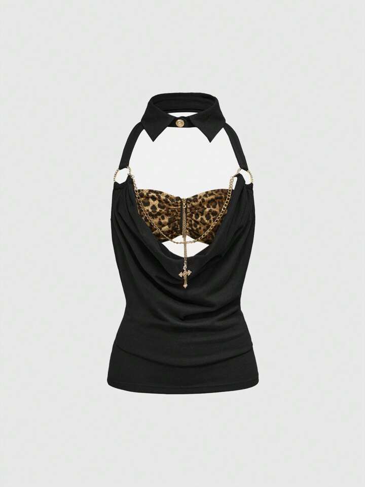 J-Fashion Y2K Harajuku Leopard Print Patchwork Draped Neck Sleeveless Top For Women