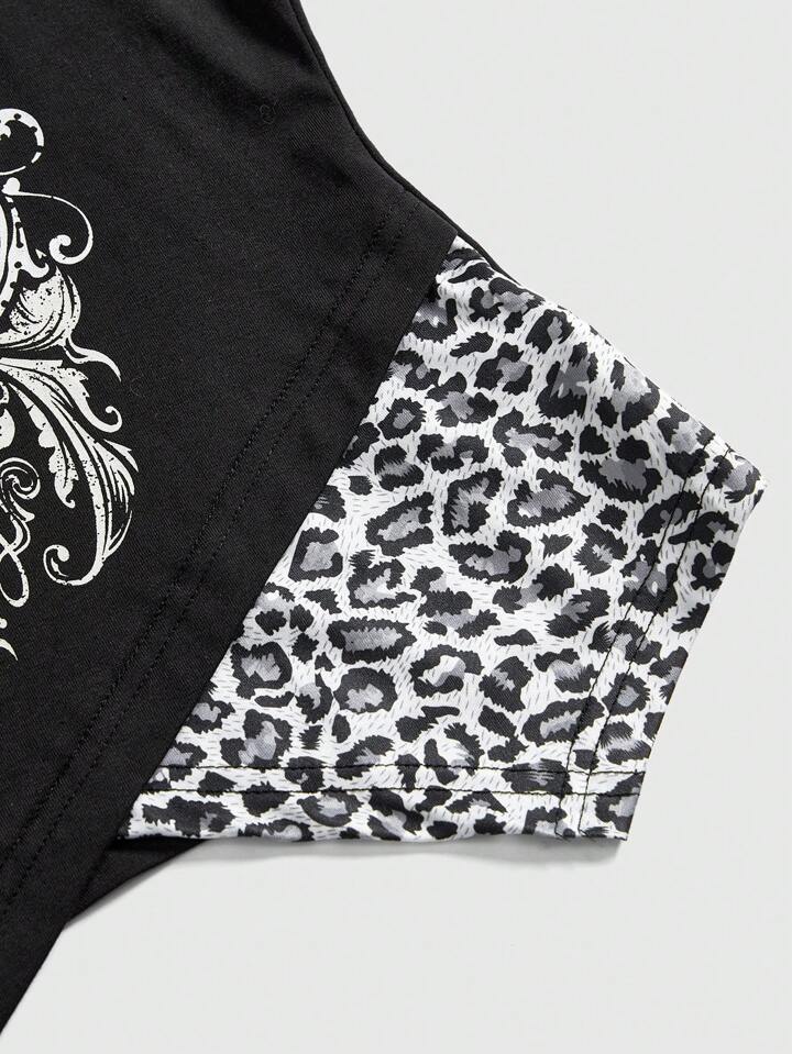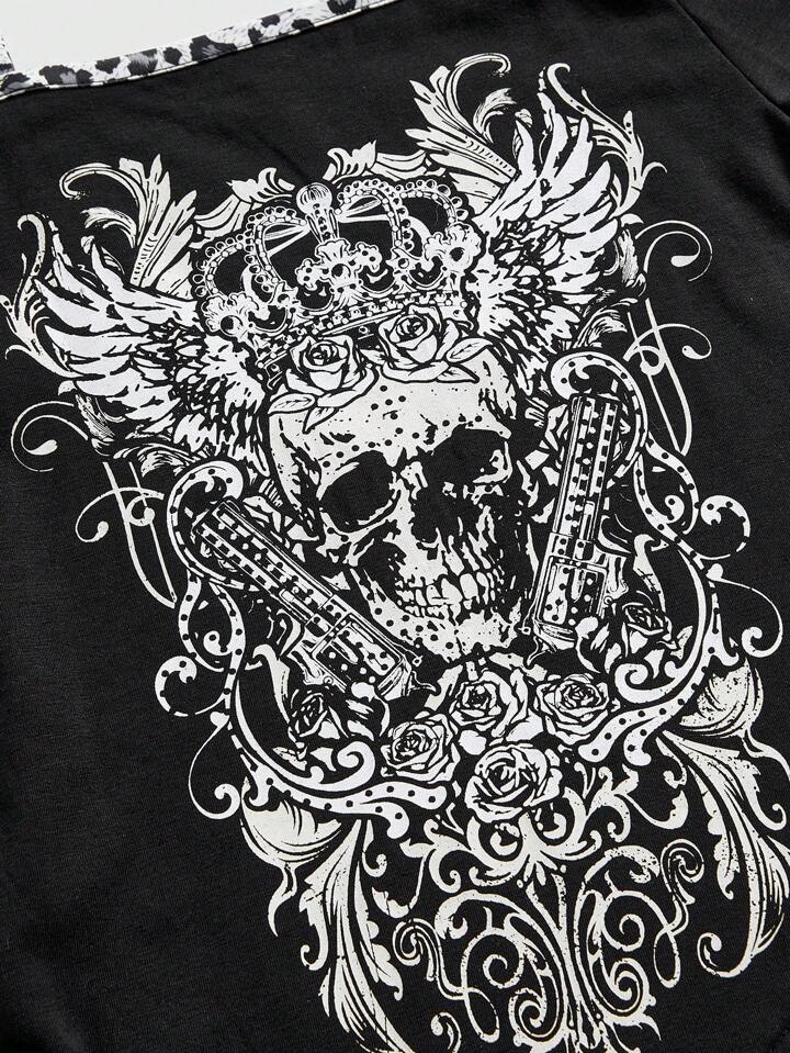 J-Fashion Y2K Punk Skull Pistol & Rose Print Diamante Lace Splice T-Shirt, For Women