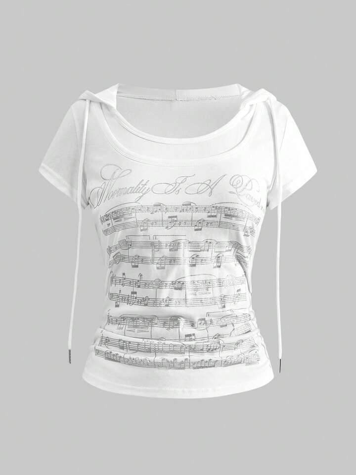 J-Fashion Y2K Retro Millennium Babe Music Note Print Hooded 2 In 1 Short Sleeve Hoodie