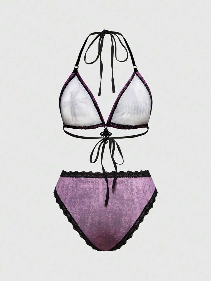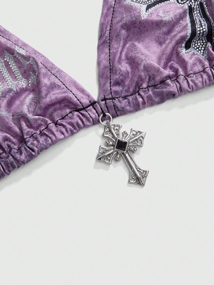 J-Fashion Y2K Retro Sexy Cross & Wing Print Tie-Up Front Wireless Bra Set For Women