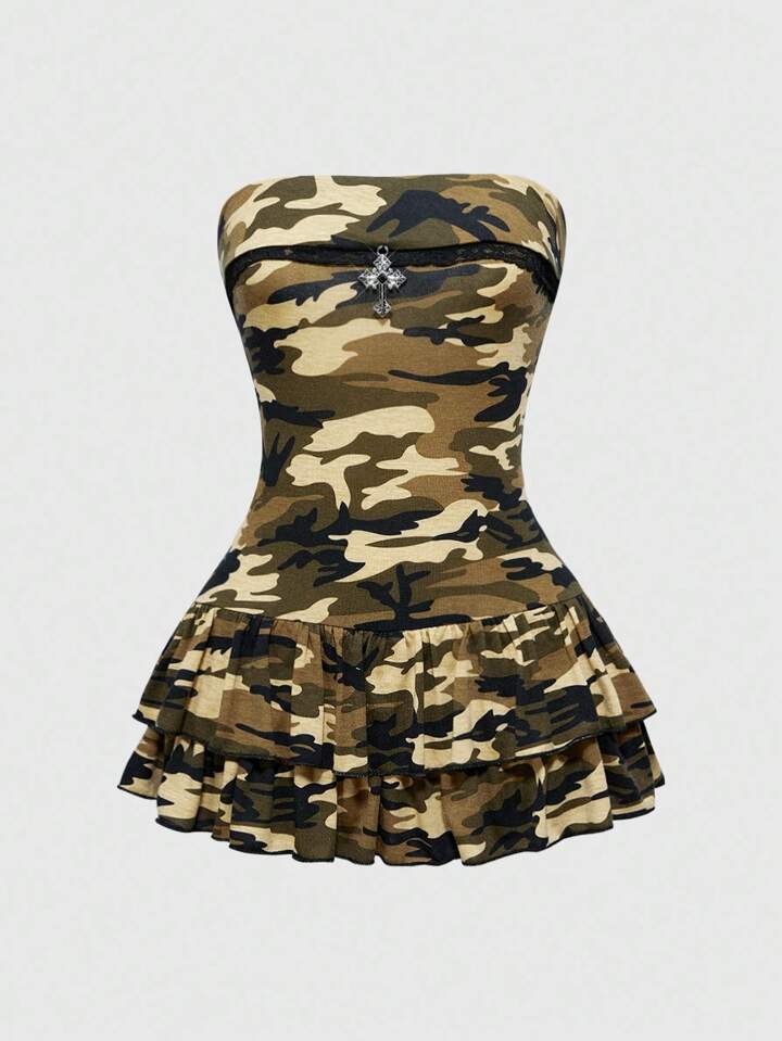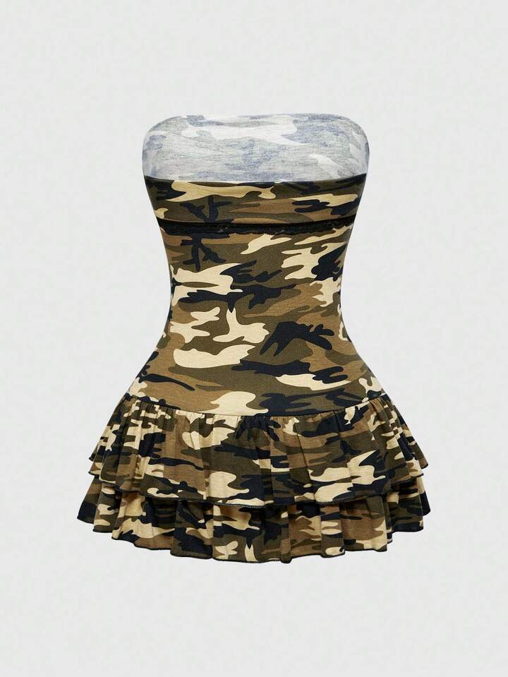 J-Fashion Y2K Sexy Camouflage Mini Puff Dress Strapless Bodycon Dress For Women