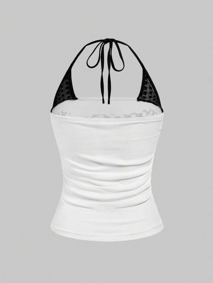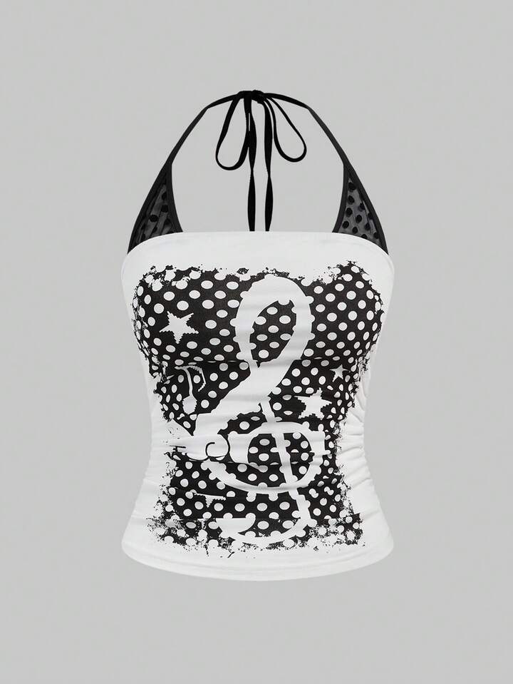J-Fashion Y2K Spice Girls Music Festival Note & Polka Dot Print 2 In 1 Contrast Lace Cotton Halter Neck Bodycon Tank Top For Women