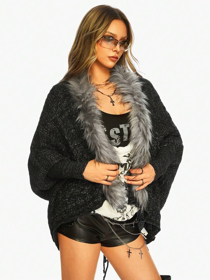 J-Fashion Y2K Style Patchwork Fuzzy Tie Batwing Sleeve Cardigan Sweater For Women