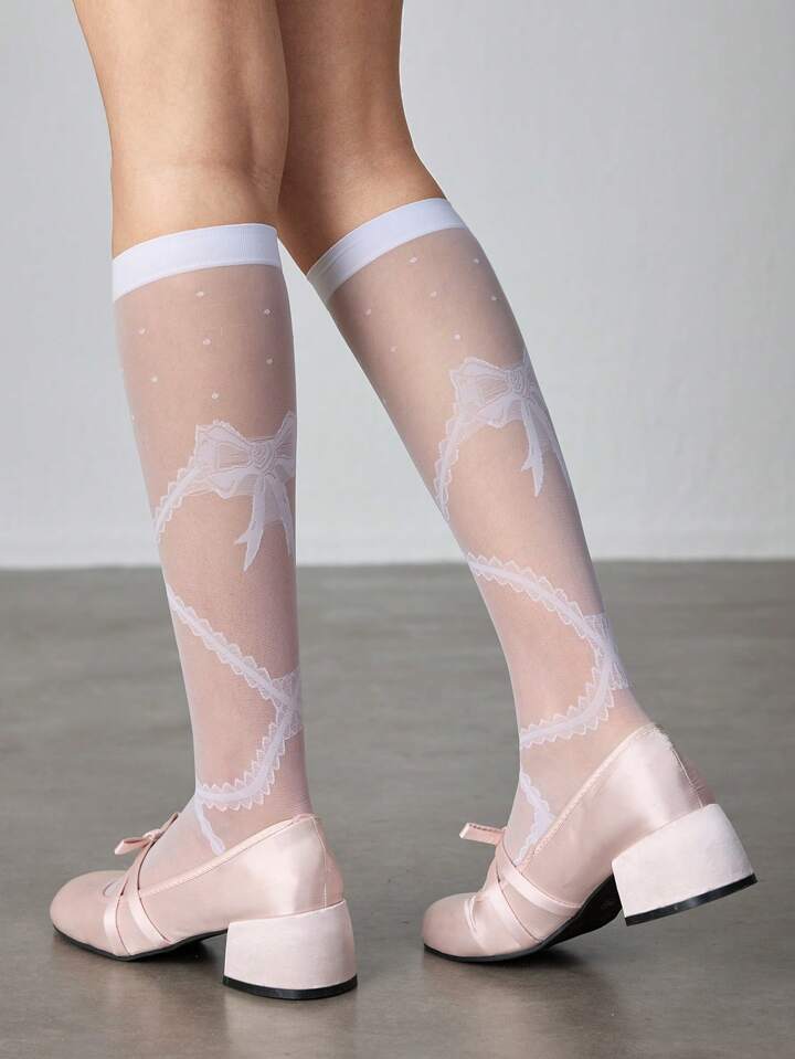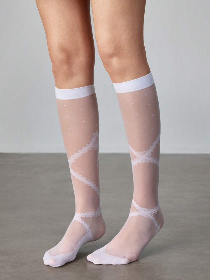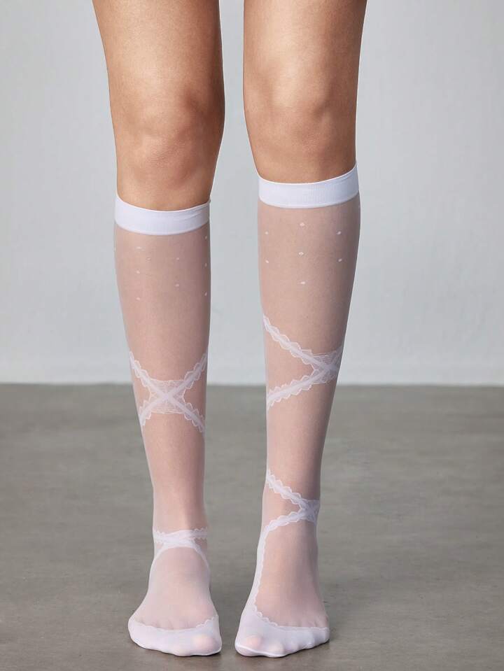 Kawaii 1 Pair Cute White Mesh Lace Trim Mid-Calf Socks, Sweet Vertical Striped Piled Socks, Versatile School Style Women Socks