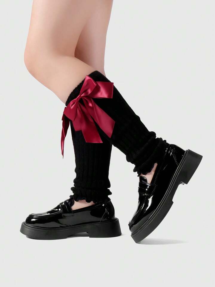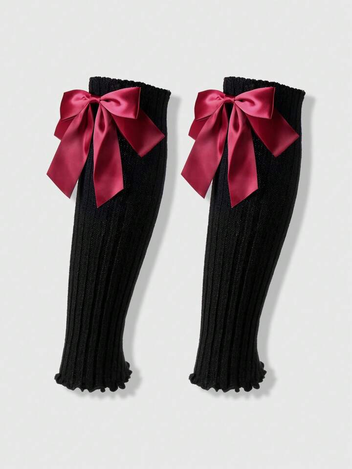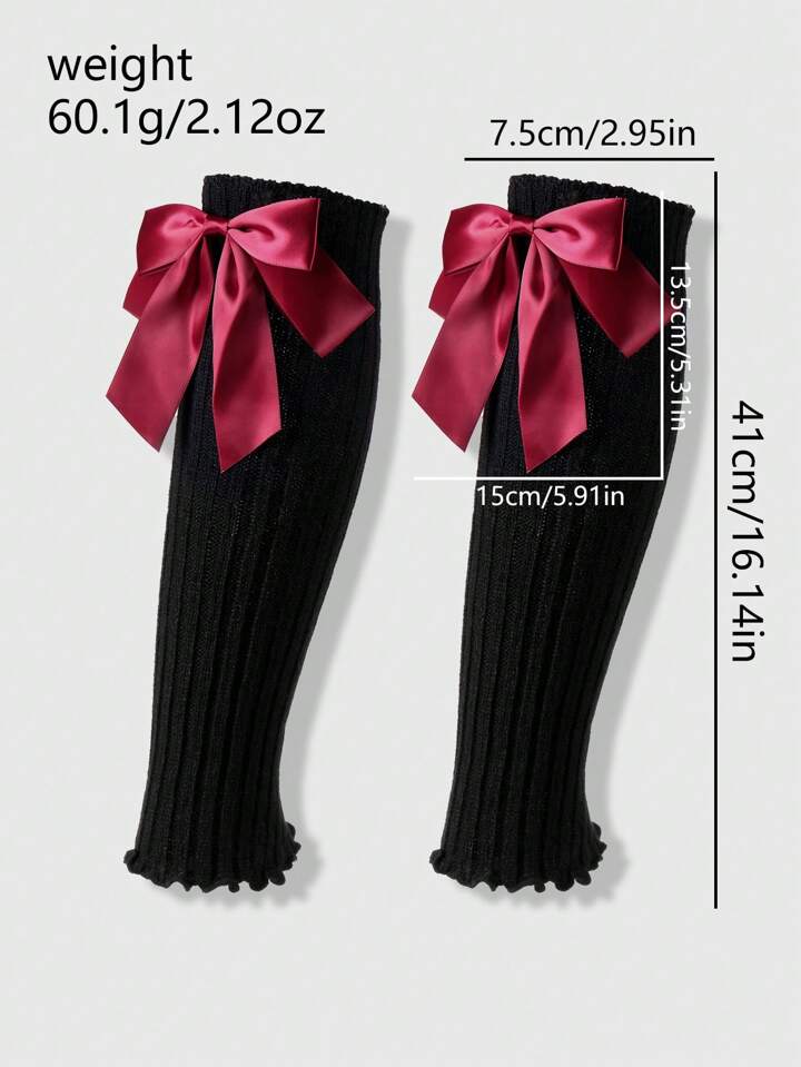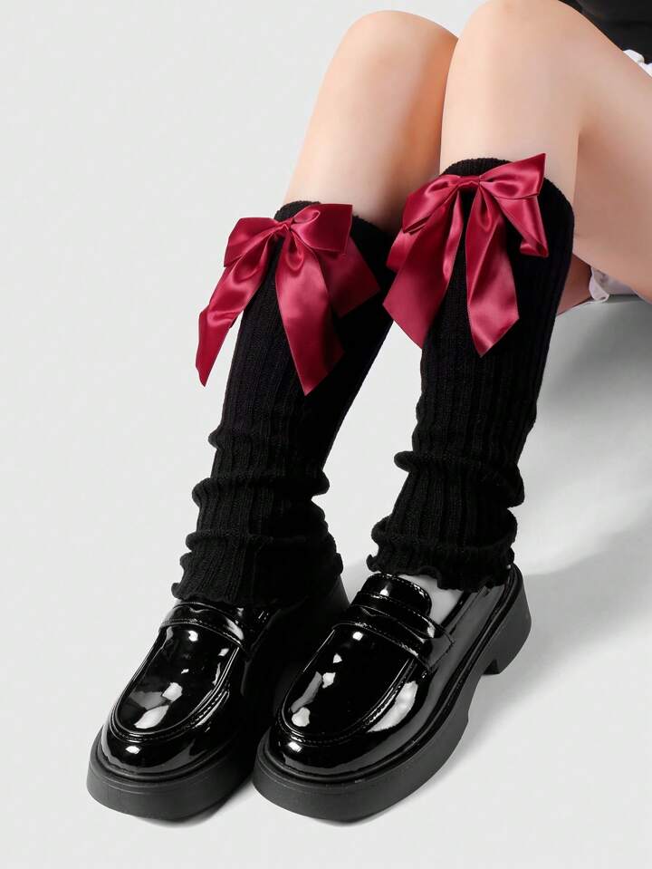 Kawaii 1 Pair Elegant Gothic Soft & Warm Vertical Striped Black And Burgundy Bow Decor Leg Warmers, Suitable For Women And Girls Daily Wear, Comes In Gift Box Packaging