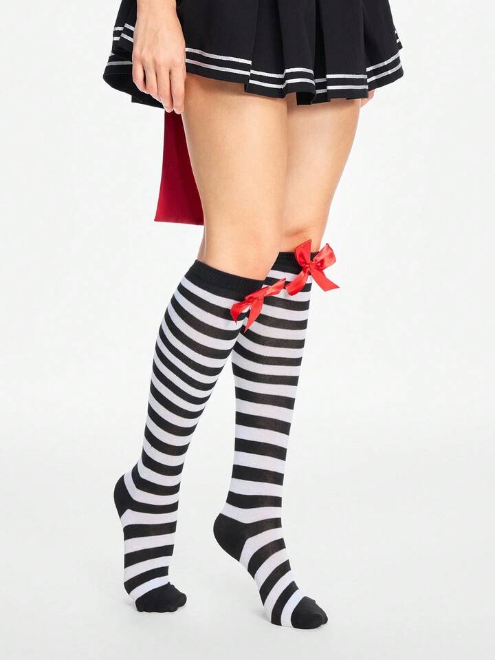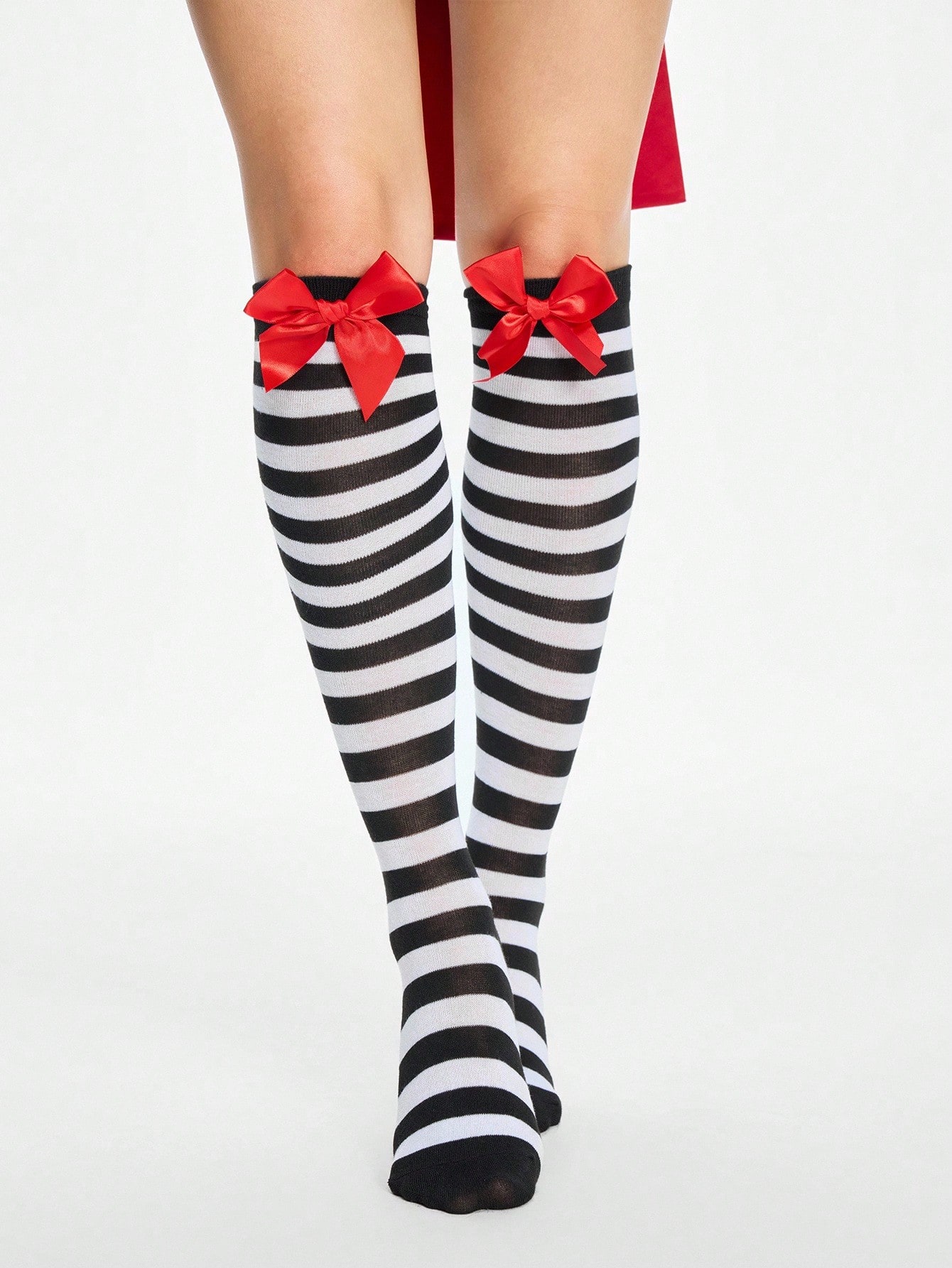 Kawaii 1 Pair Fashionable Holiday Attire Black & White Striped Big Bow Decor Women Mid-Calf Socks