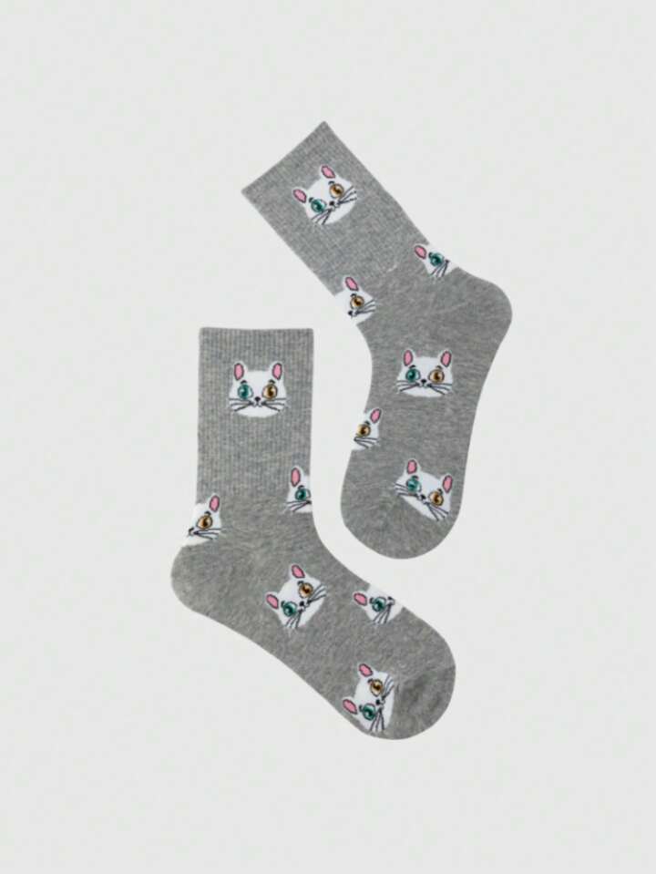 Kawaii 1 Pair Of Kitten Print Gray Women's Mid-calf Socks