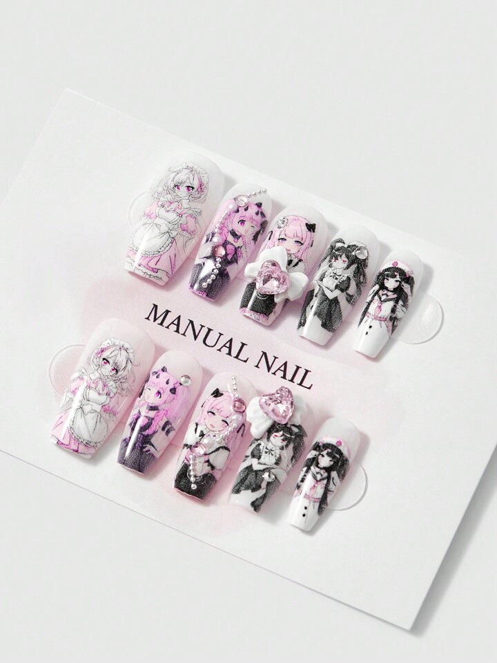 Kawaii 10 Pcs Anime Girl Hand-Painted Reusable False Nails With Jelly Gel, Set