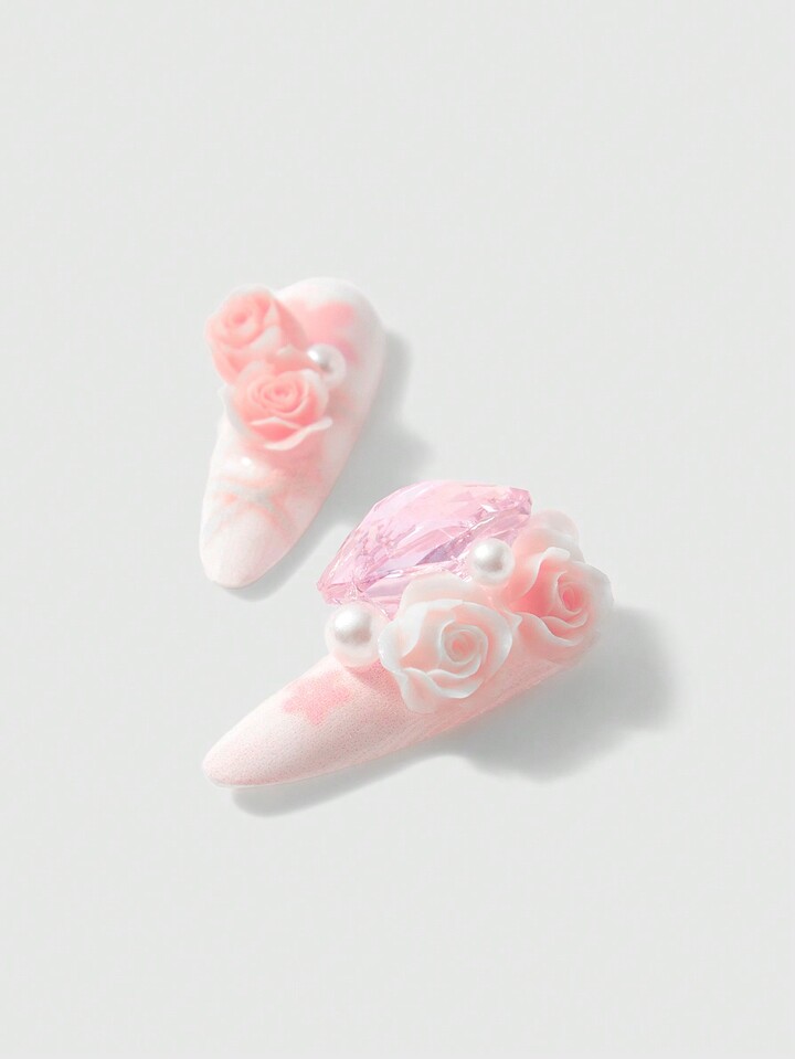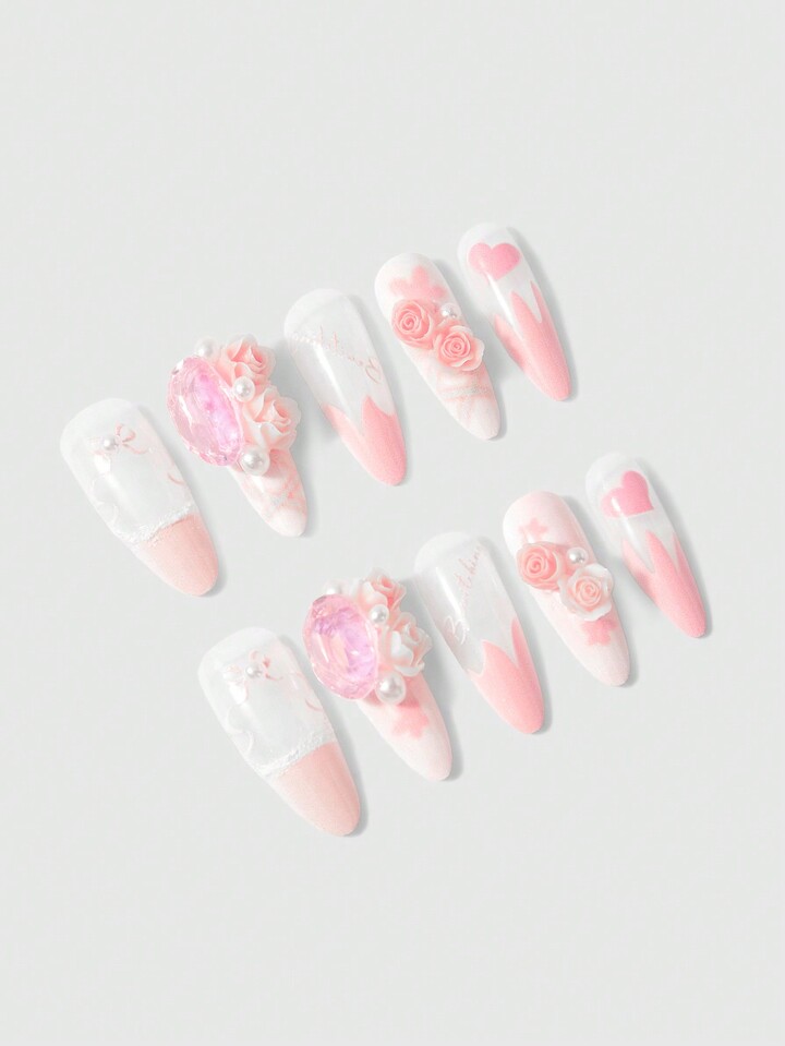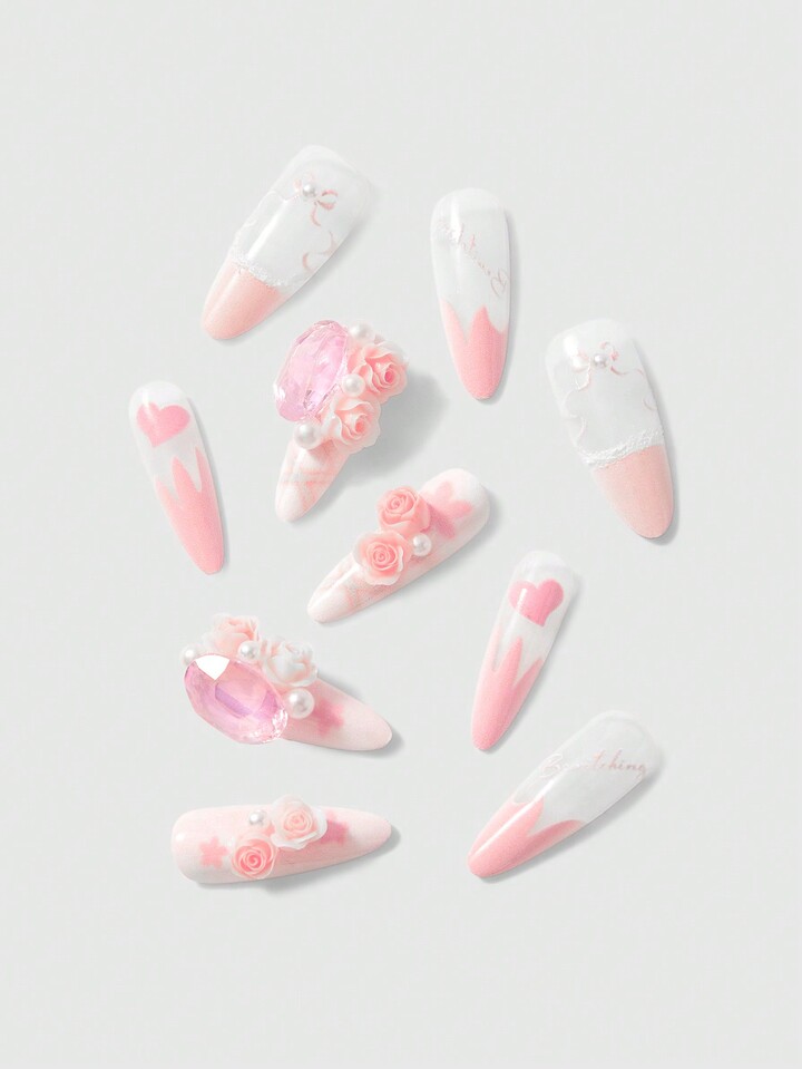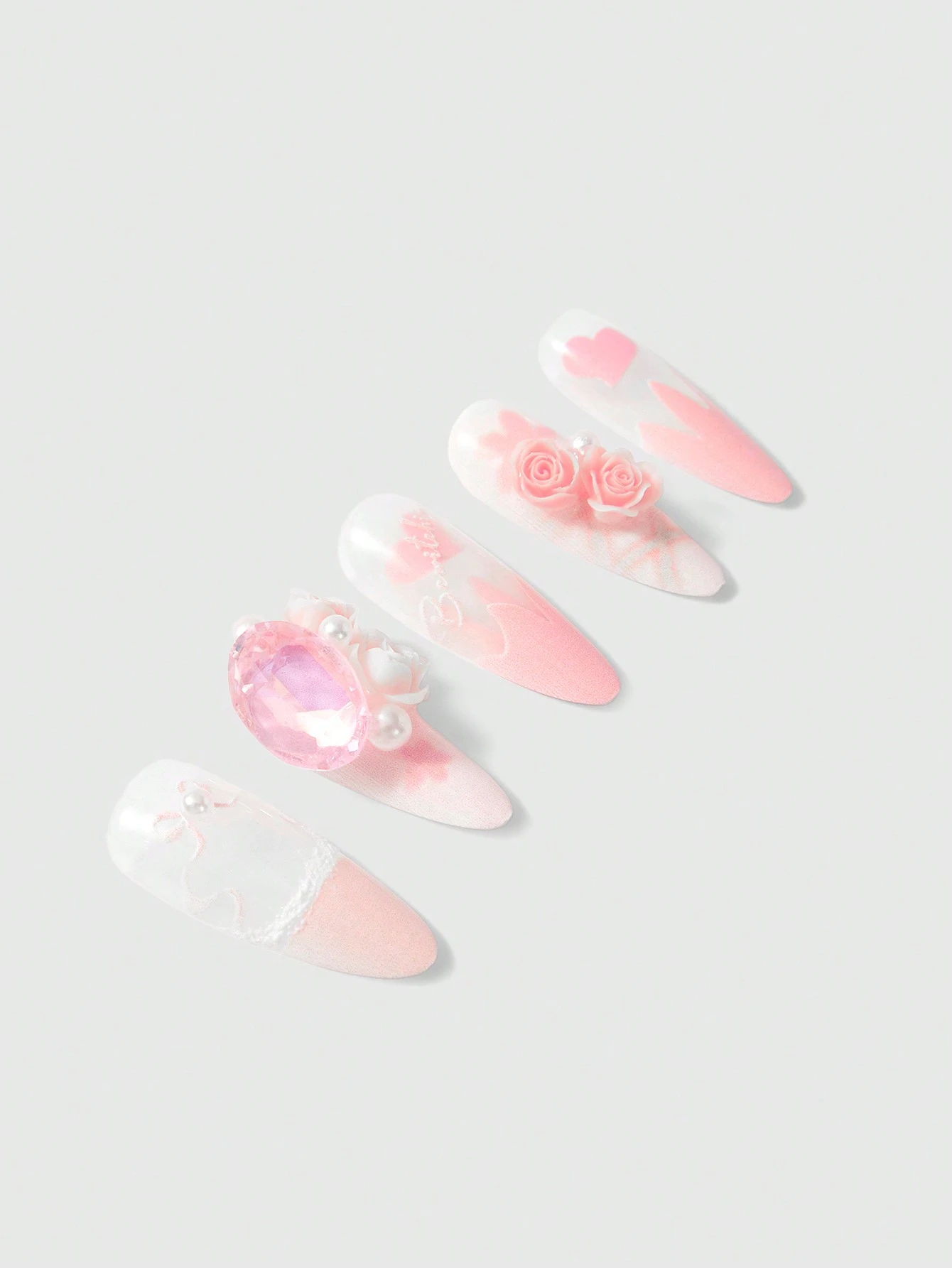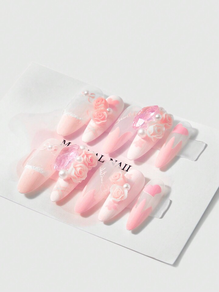 Kawaii 10pcs Almond-Shaped Soft Pink Rose Bow Tie Floral Reusable Press-On Nails With Jelly Gel, DIY