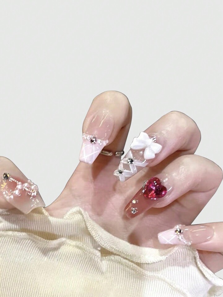 Kawaii 10pcs Long Coffin 3D Bow Decor Fake Nail & 1sheet Tape