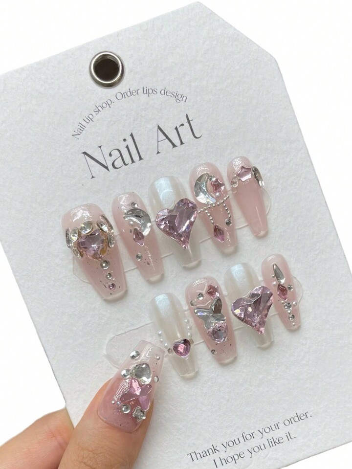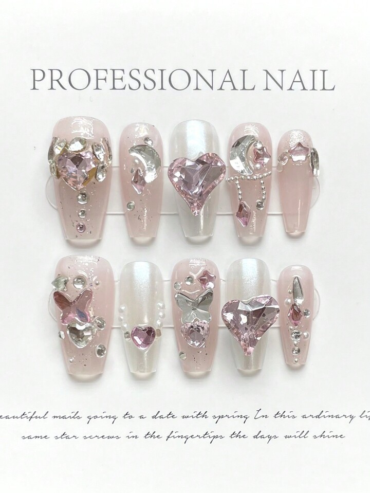 Kawaii 10pcs Long Coffin Heart & Butterfly Rhinestone Decor Fake Nail Kit