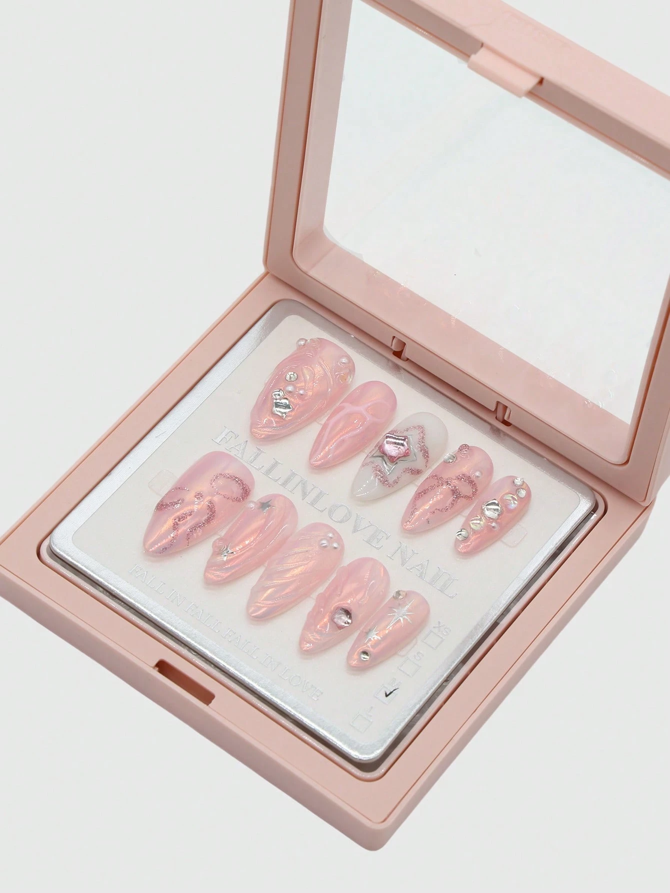 Kawaii 10pcs Pink Bow High Quality Handmade False Nails + 3pcs Double-Sided Adhesives, Y2K Style Manicure, Detachable Holographic Pink Nail Stickers, Suitable For Festivals, Parties, Dancing And Daily Wear (Jewelry Box Packaging)