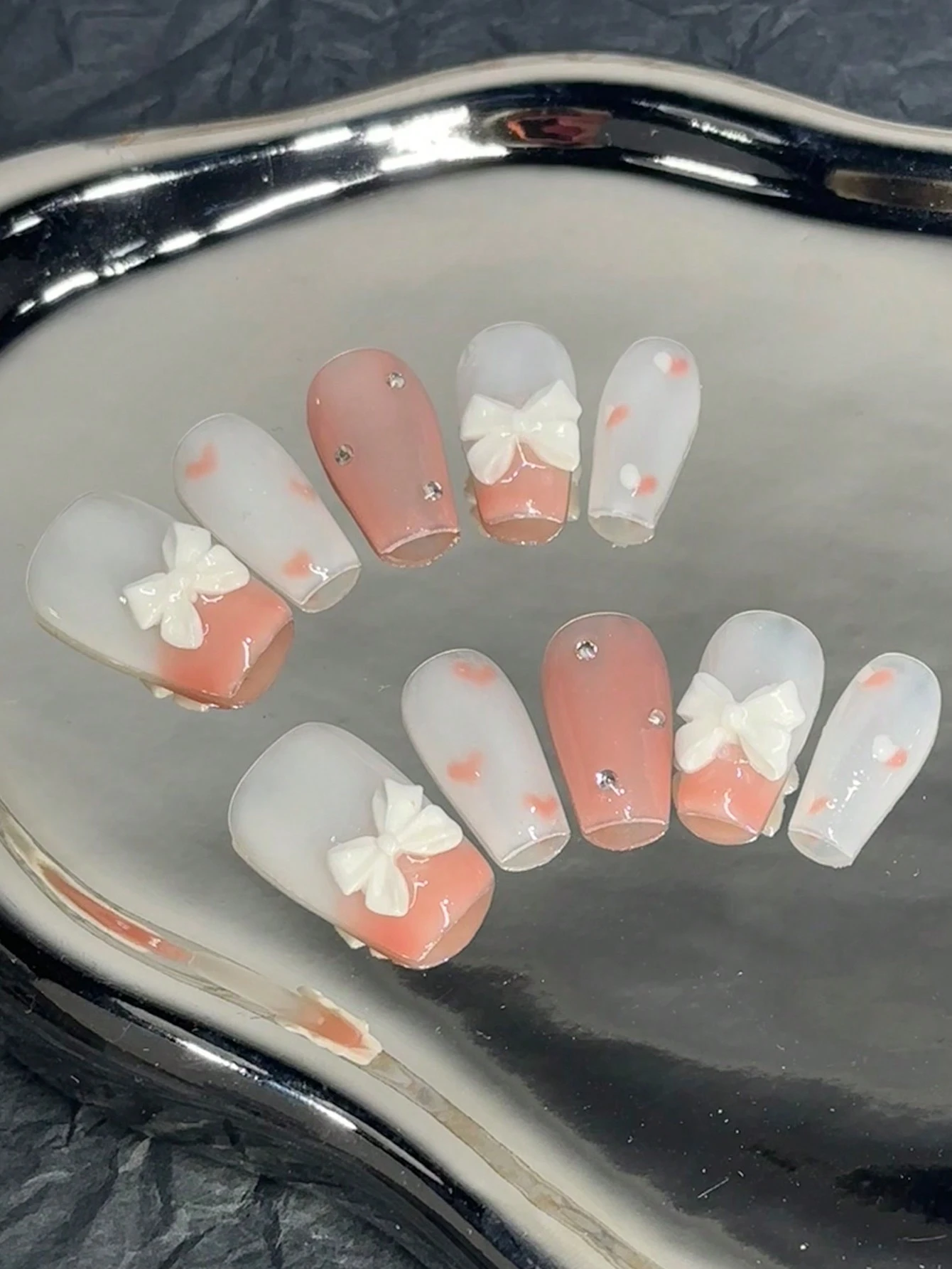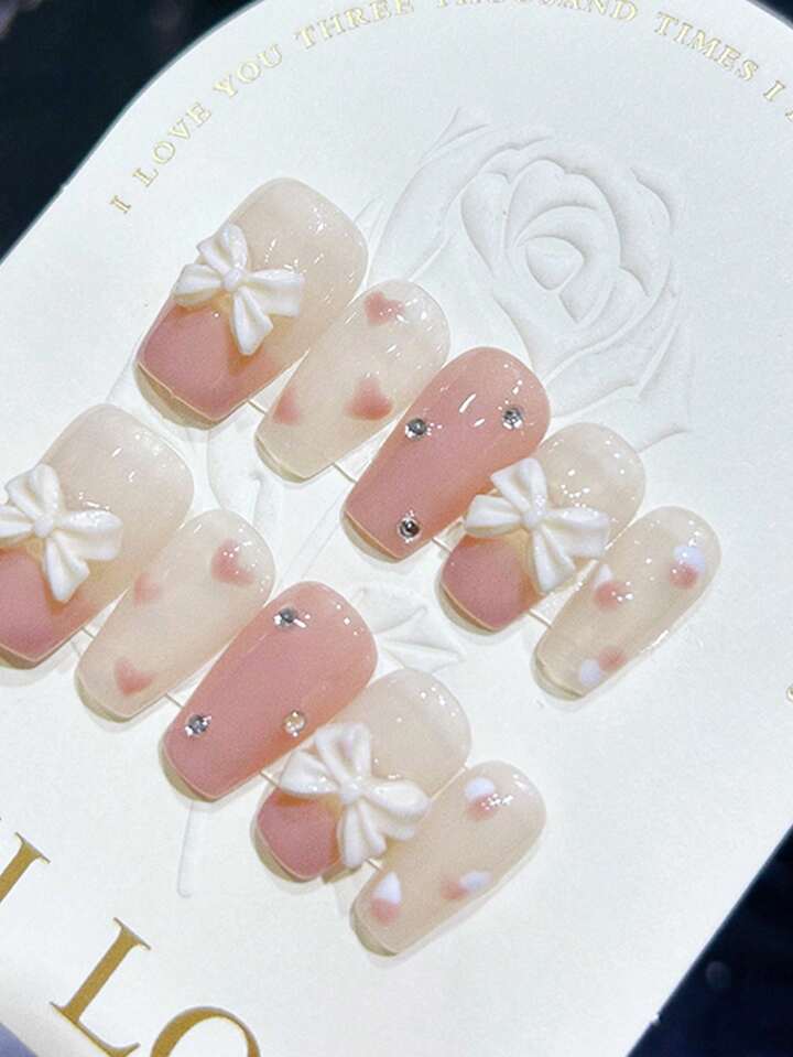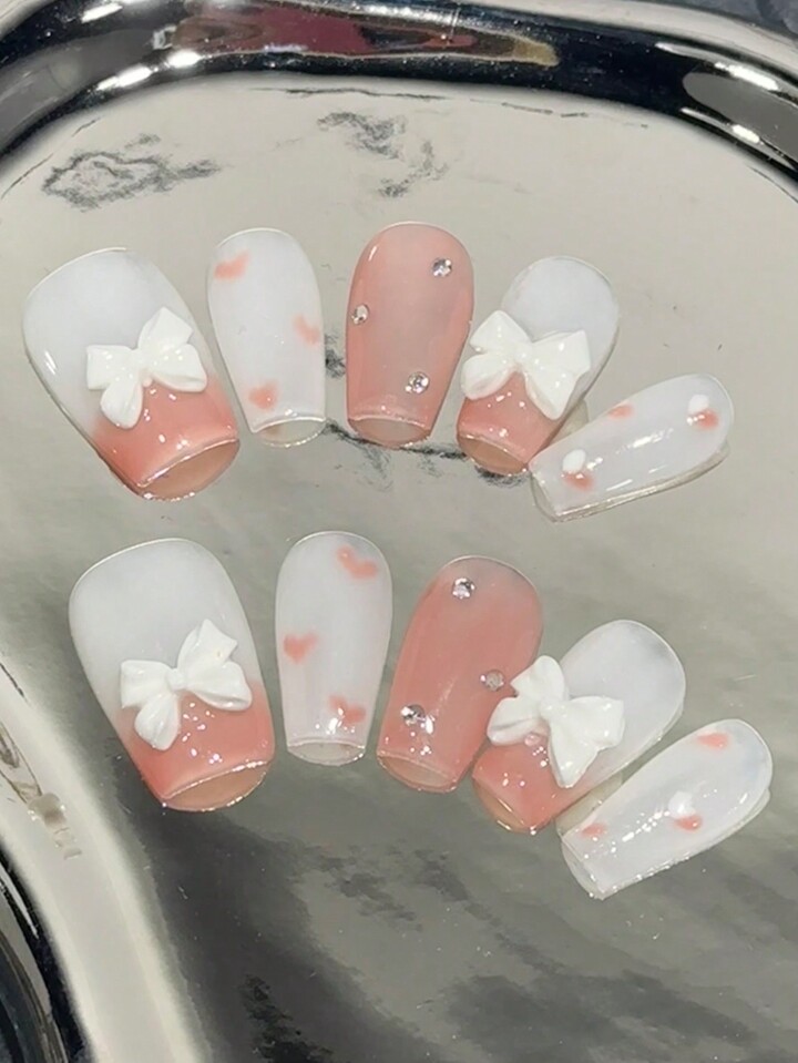Kawaii 10pcs Short Coffin Bow & Rhinestone Decor Fake Nail Kit