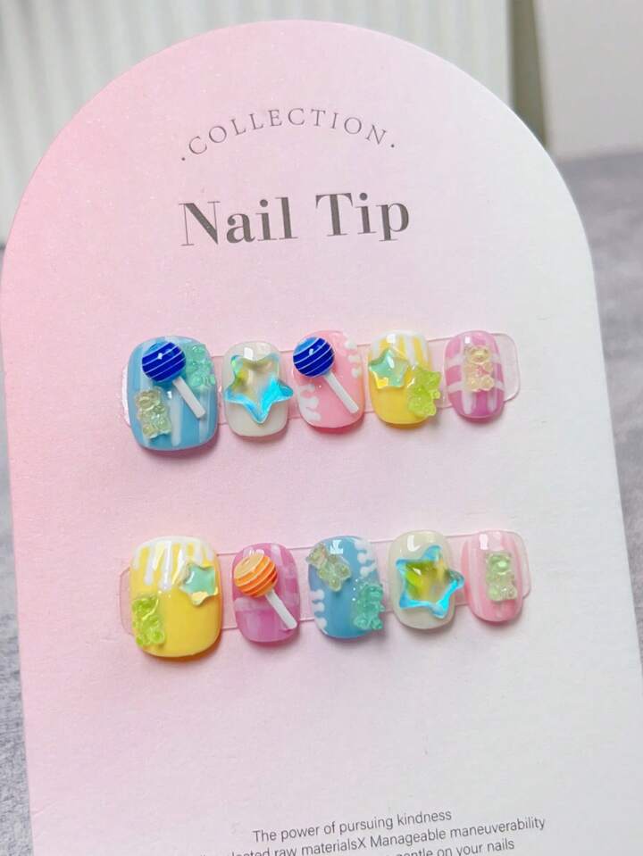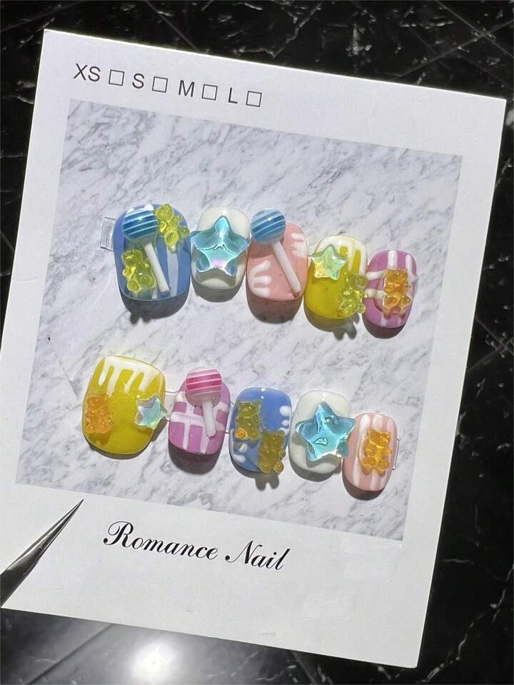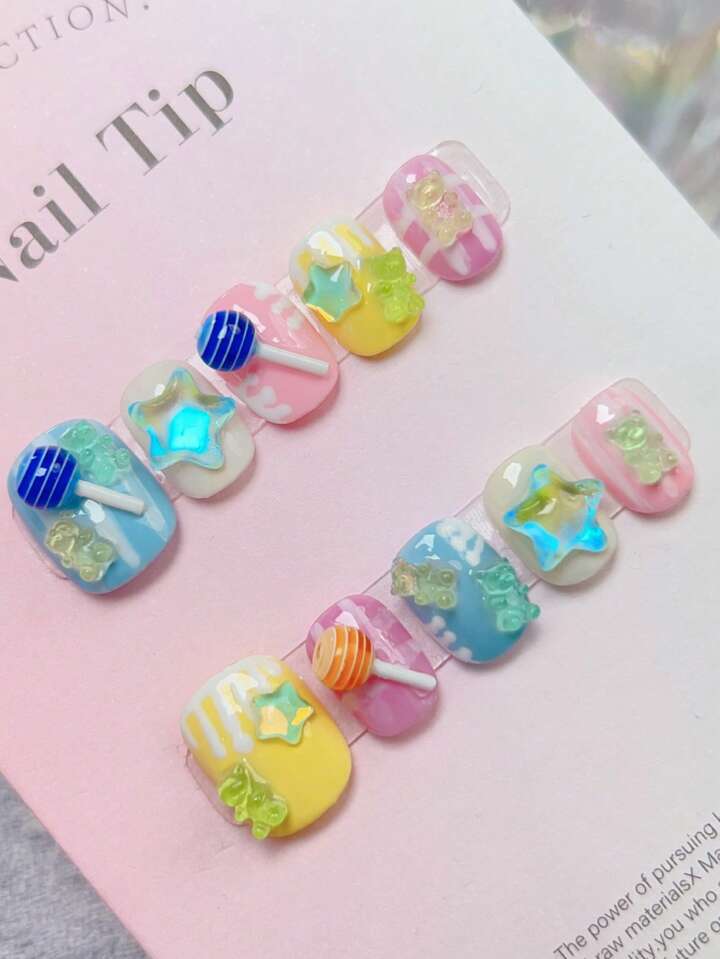 Kawaii 10pcs Short Square Star & Cartoon Bear Decor Fake Nail Kit
