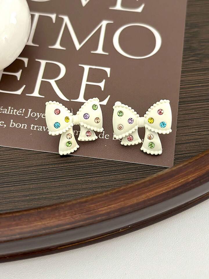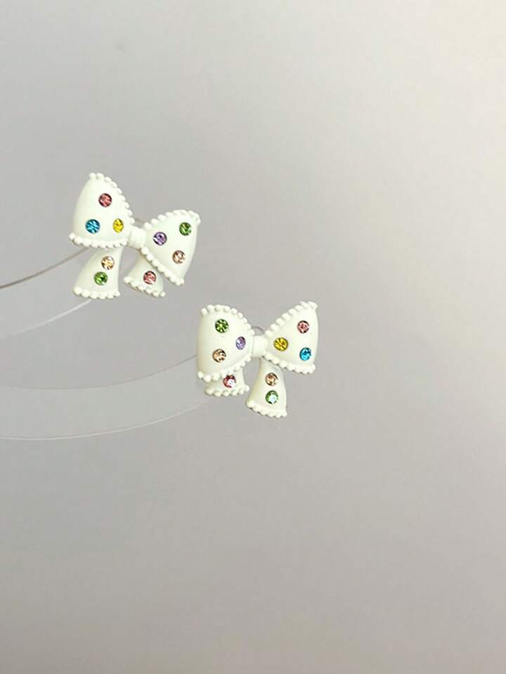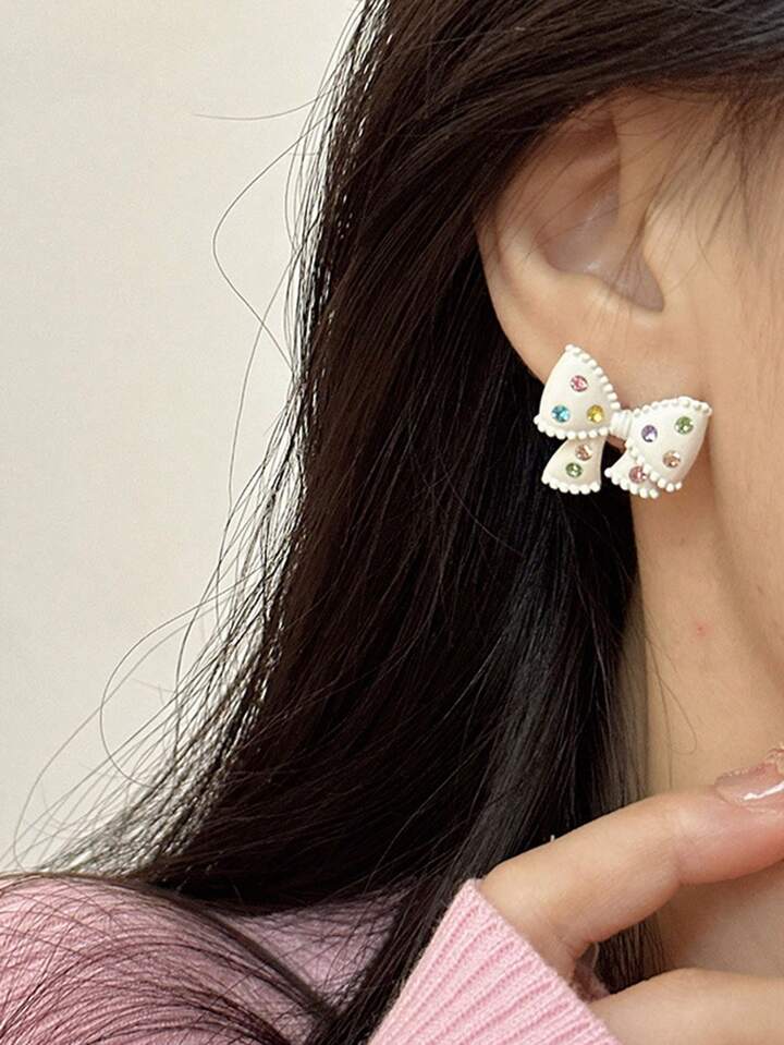 Kawaii 1pair Milk White Rhinestone Inlaid Bow Stud Earrings