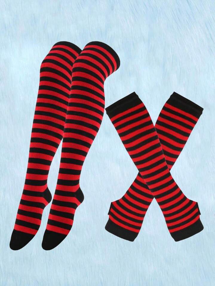 Kawaii 1pair Striped Over The Knee Socks & 1pair Fingerless Gloves