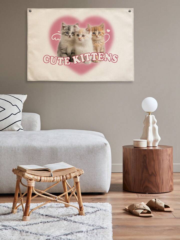 Kawaii 1pc Adorable Pink Cat & Heart Pattern Linen Punching Wall Hanging Cloth For Living Room & Bedroom Decoration