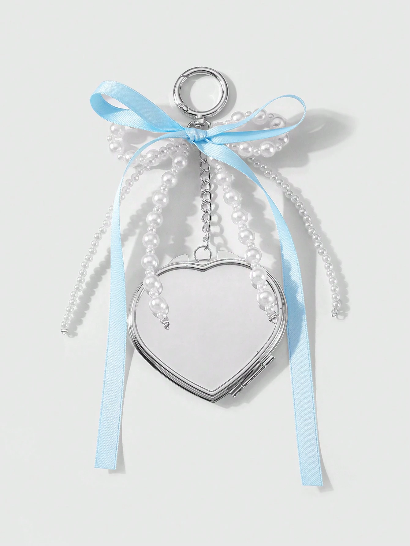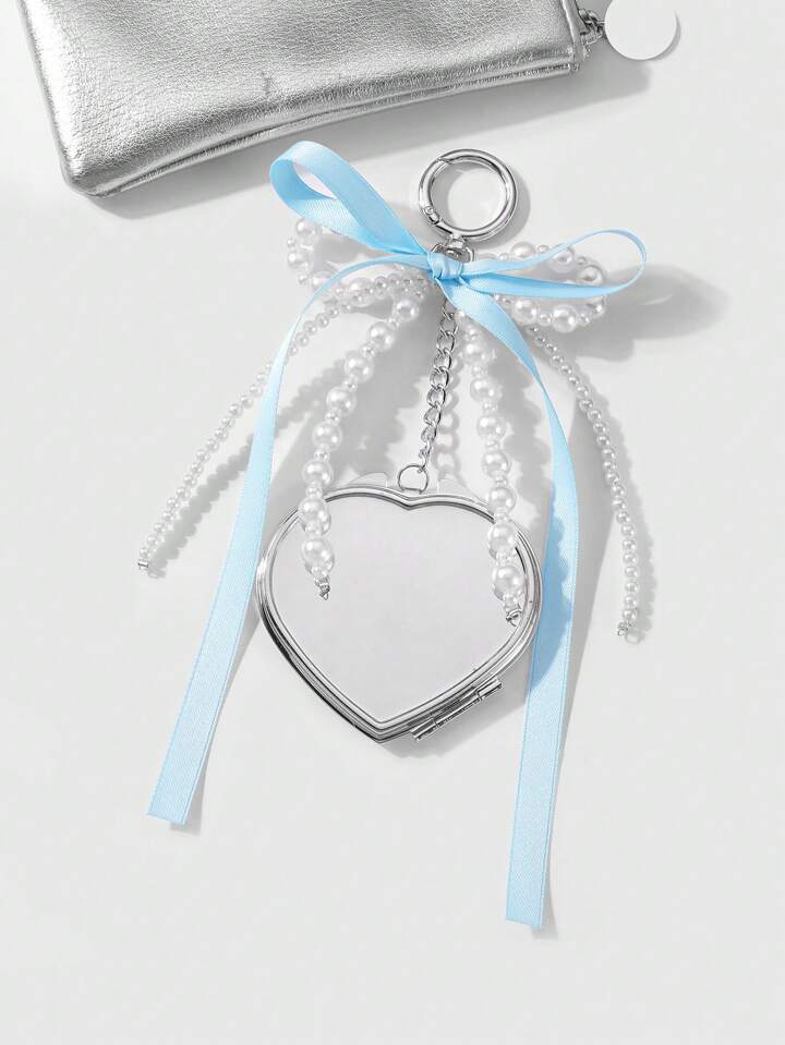 Kawaii 1pc Delicate Minimalist Chic Fresh High-End Handmade Beaded White Faux Pearl Blue Ribbon Bow Devil Heart Openable Double-Sided Glass Mirror Pendant Keychain, Suitable For Women/Girls, Great Gift