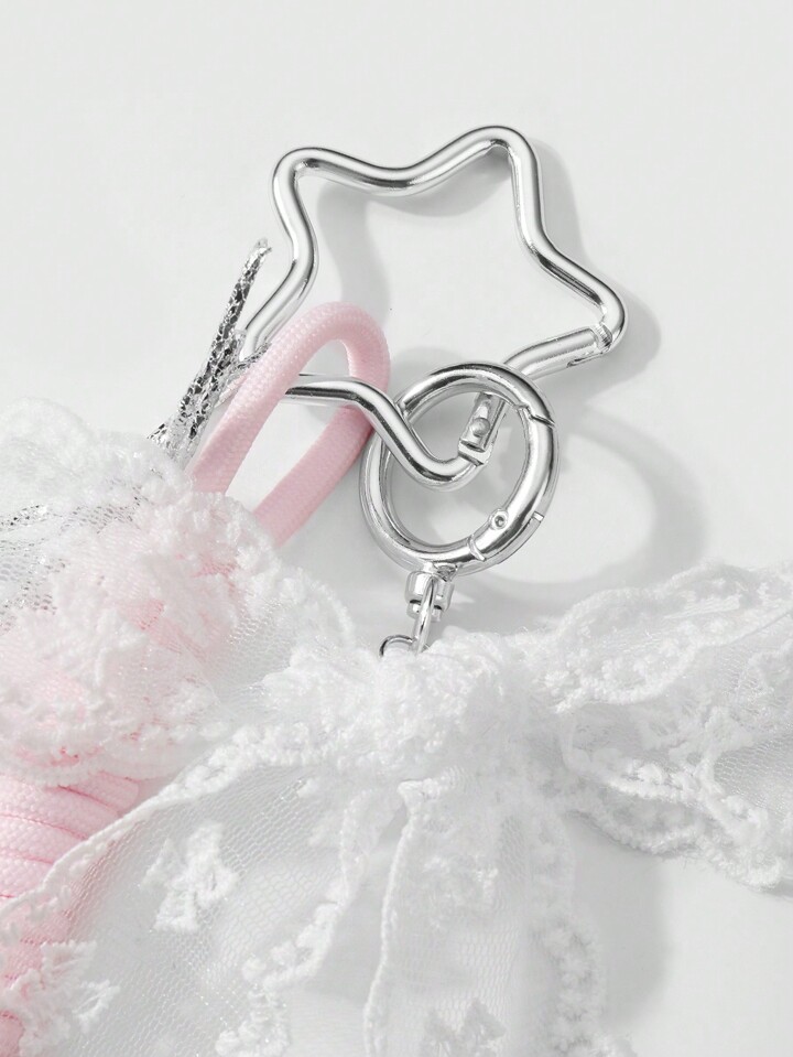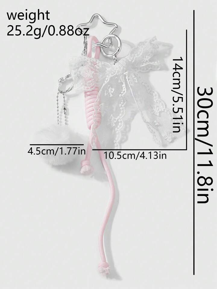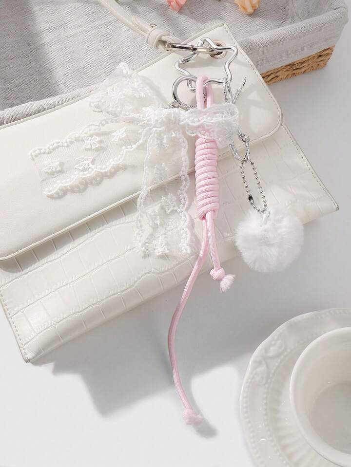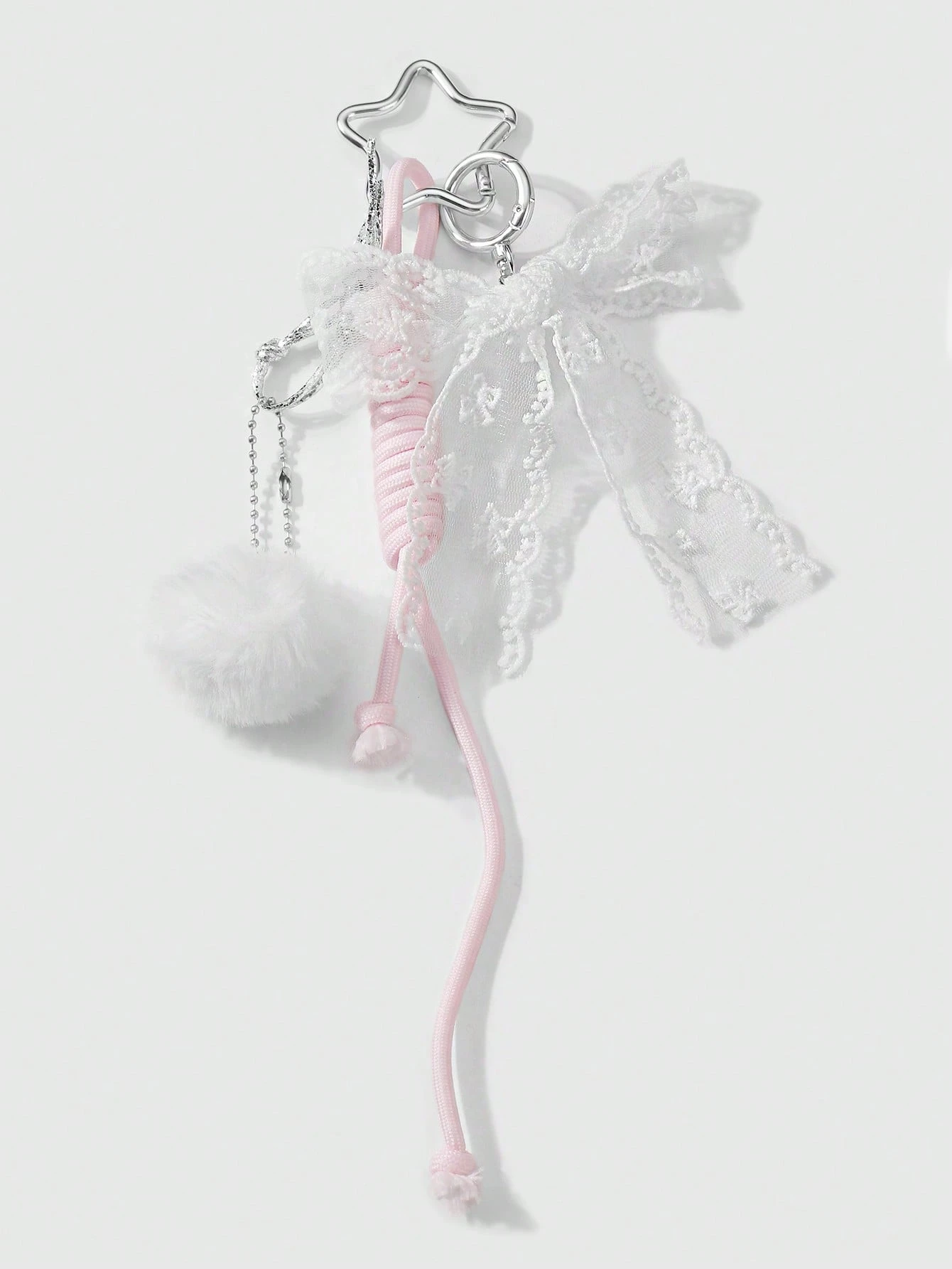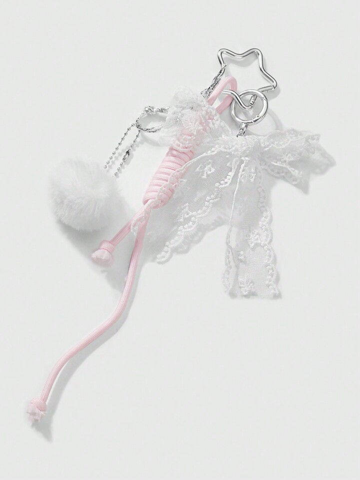 Kawaii 1pc Elegant & Fashionable Girly Versatile High-Quality Silver Shiny Rope, White Fluffy Pom Pom, Net Lace, Embroidered Bowknot , Adjustable Lanyard, Star Decor Keychain & Bag Charm, Suitable For Women, Girls, Daily Use, Holiday Gift