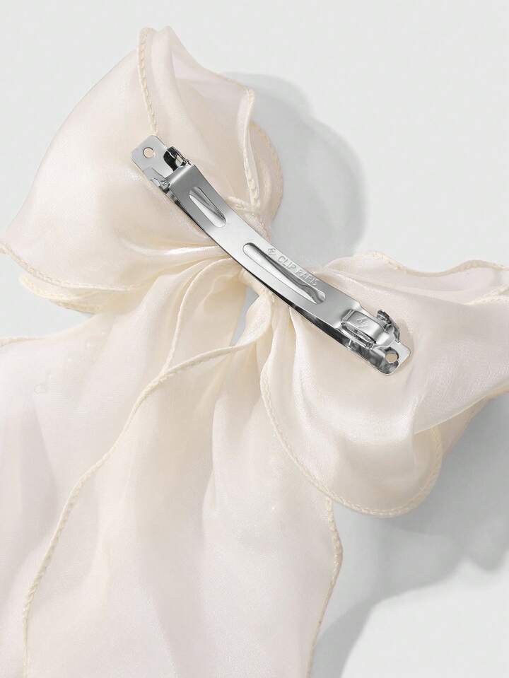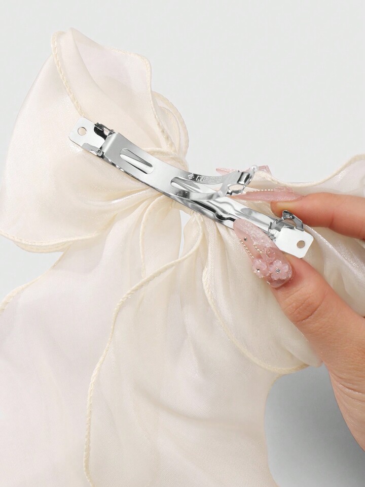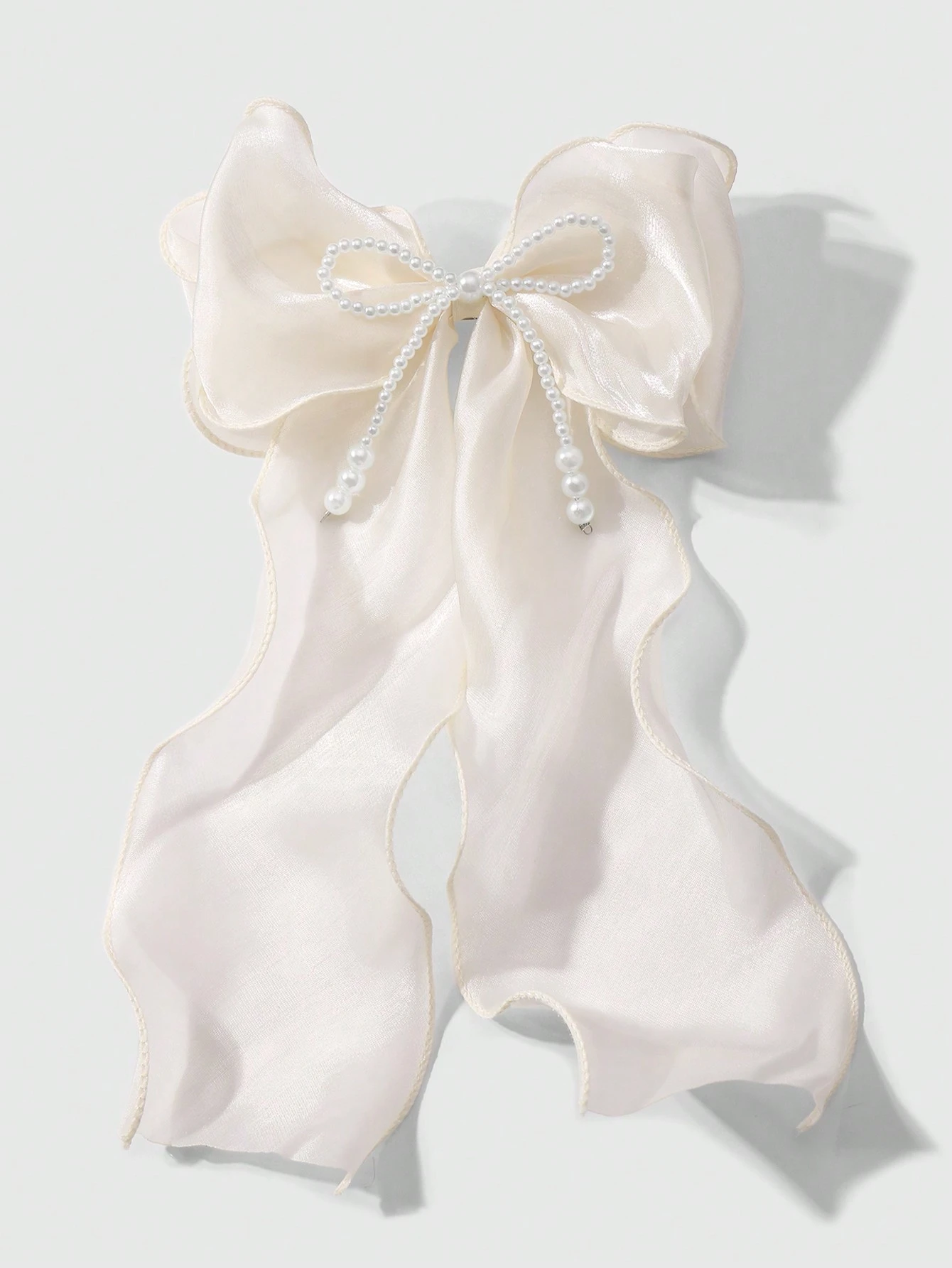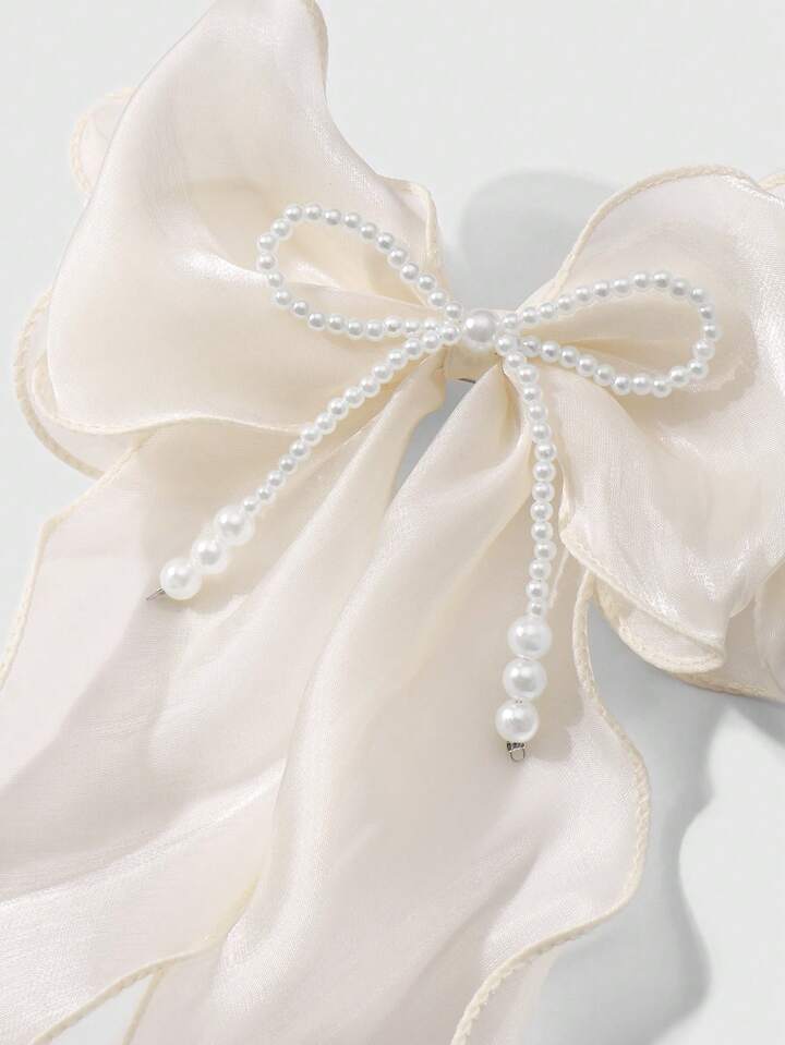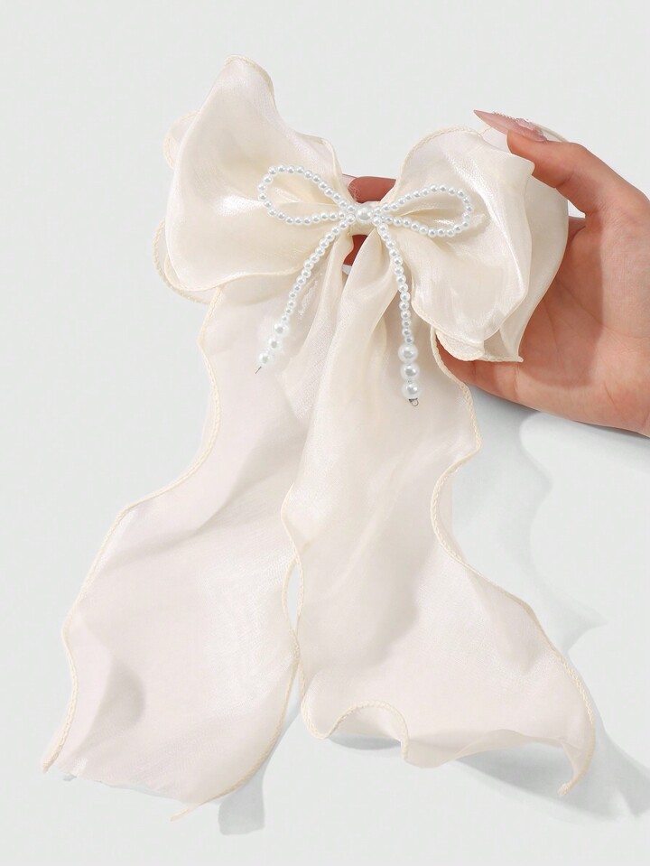 Kawaii 1pc Elegant & Fashionable Handmade Beaded White Faux Pearl Mesh Double Bow Hairclip, Spring Clamp Design For Women,Suitable For Daily Wear & Holiday Gift