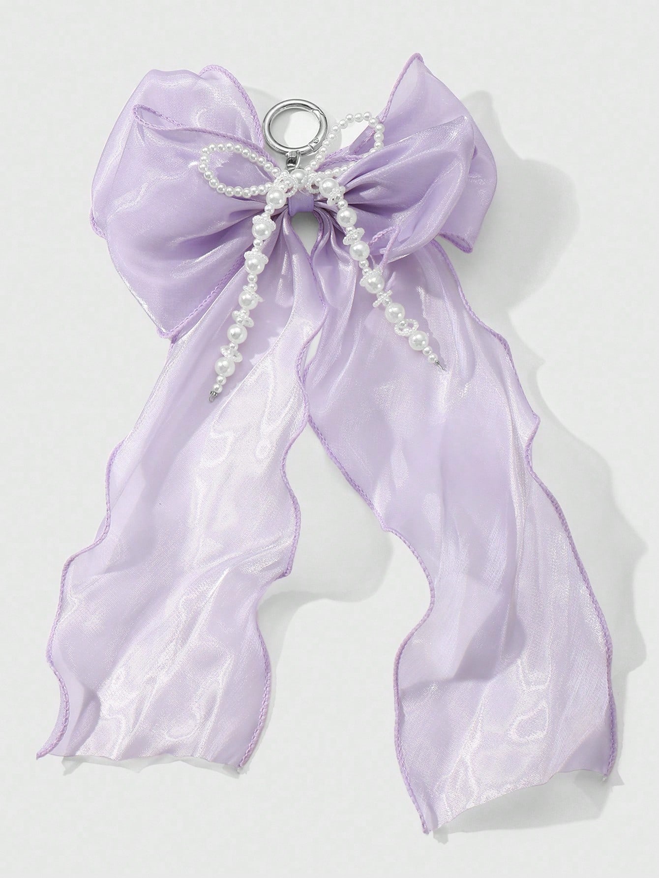 Kawaii 1pc Elegant Handmade Beaded White Faux Pearl, Purple Glitter Mesh Multi-Layer Bow DIY Keychain, Versatile Accessory Suitable For Women, Gift For Holidays