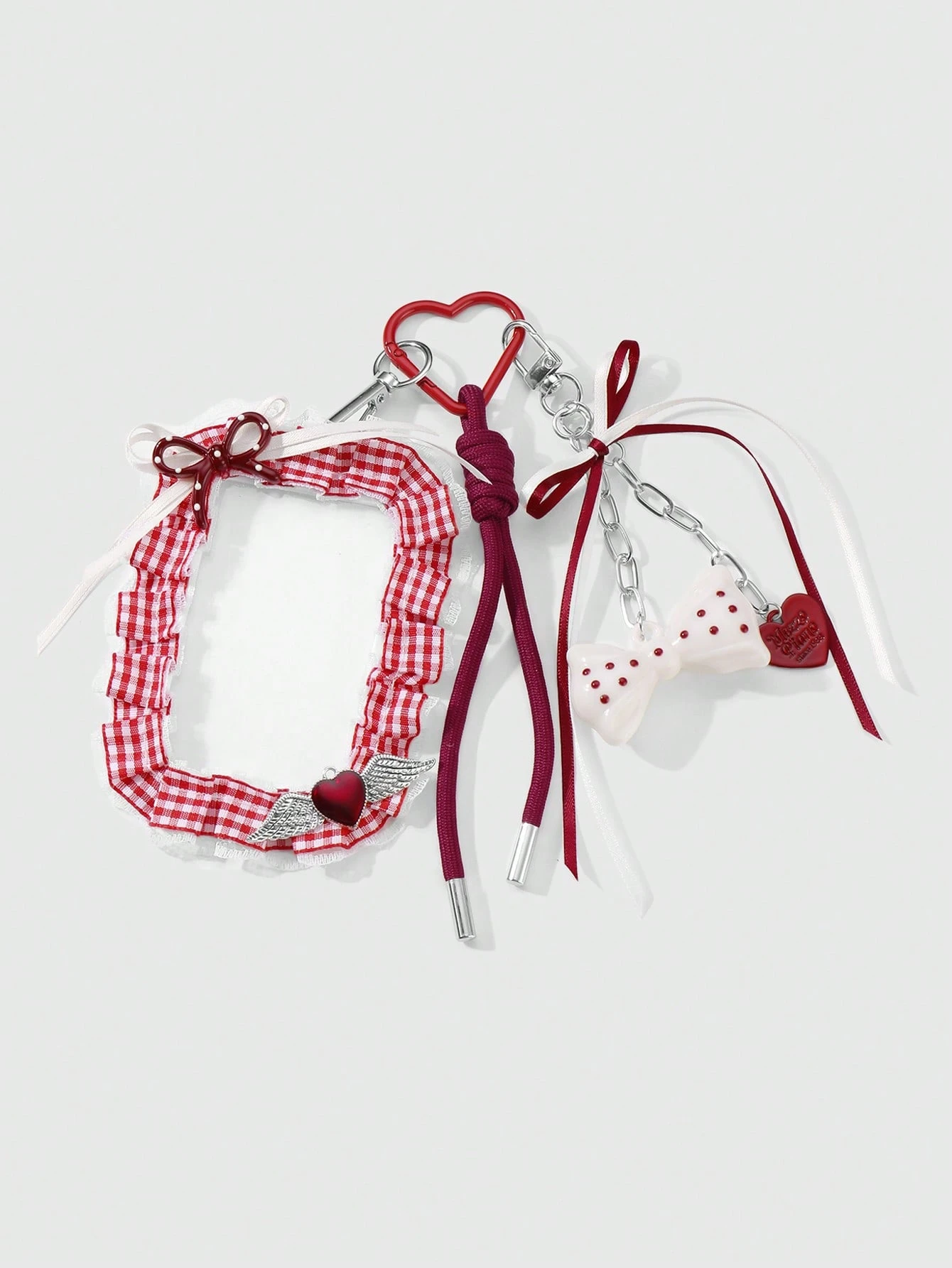 Kawaii 1pc Elegant Sweet Fashion Versatile High-Quality Silver Chain Letter Heart Dripping Oil Ribbon Bow Rhinestone Wing Heart Grid Card Case & Lanyard Keychain, Suitable For Office Workers, Students, Daily Wear, Festival Gift