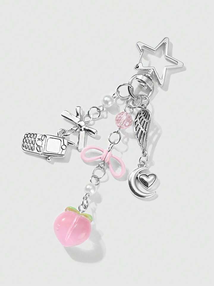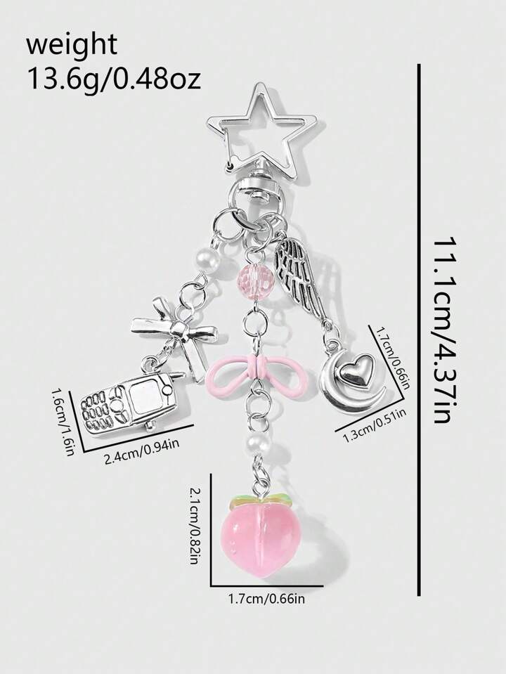 Kawaii 1pc Fashionable, Versatile & Adorable Silver Chain Bowknot, Heart, Moon Resin Faux Pearl Peach Pendant Keychain & Bag Charm, Suitable For Women, Daily Wear Or Gift