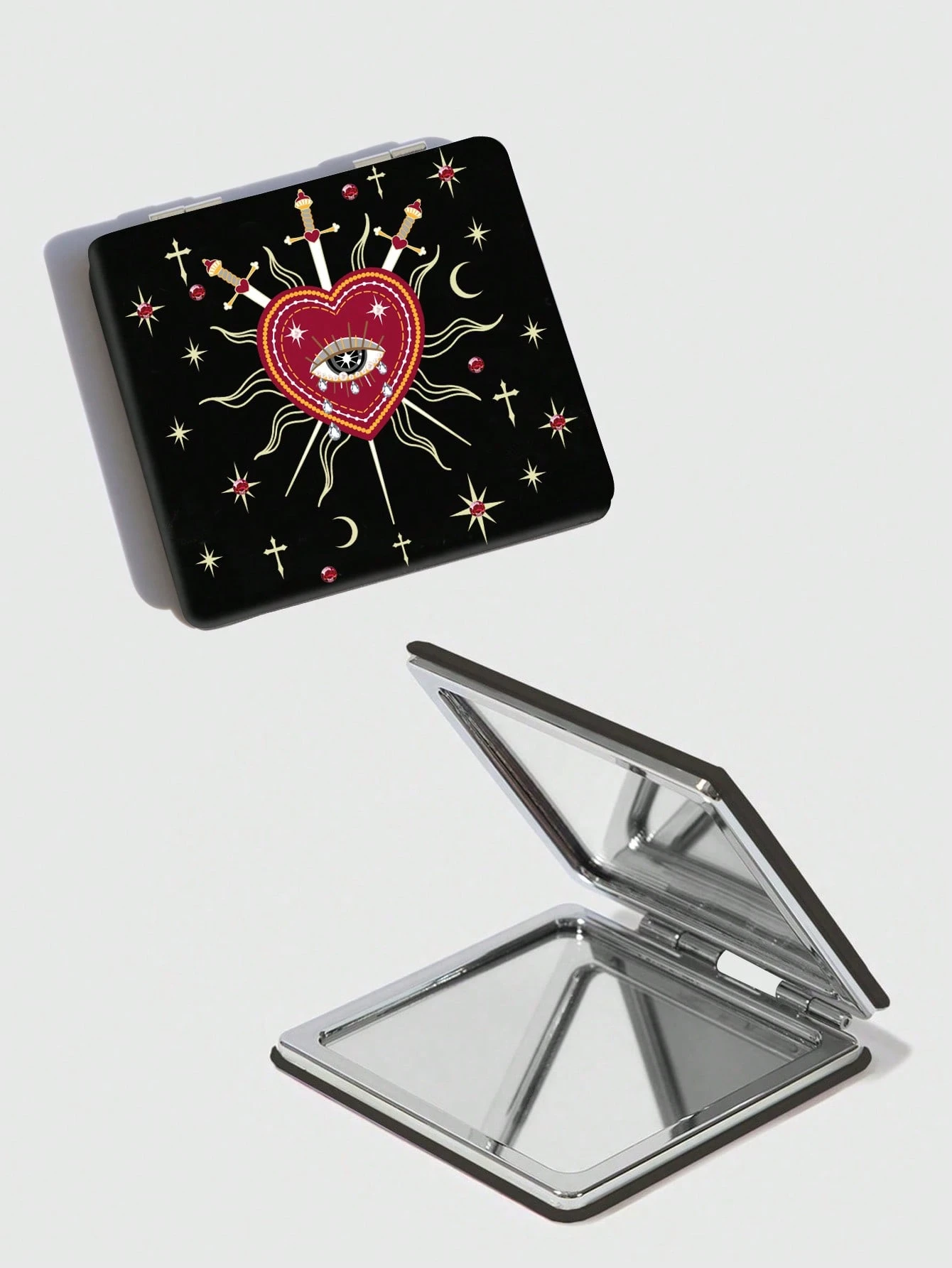 Kawaii 1pc Gothic Heart Cross Print Square Compact Mirror, Convenient Handheld For Makeup, Random Pattern Design