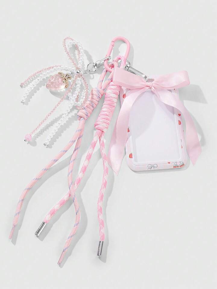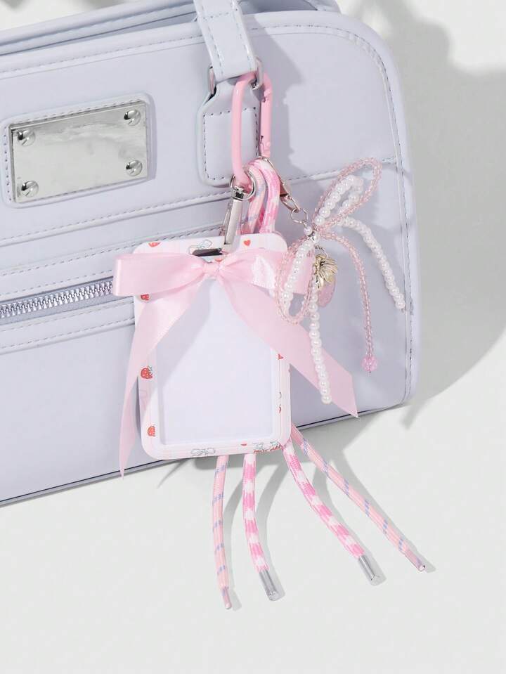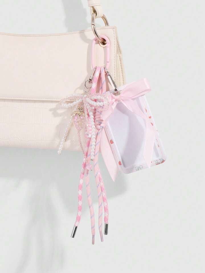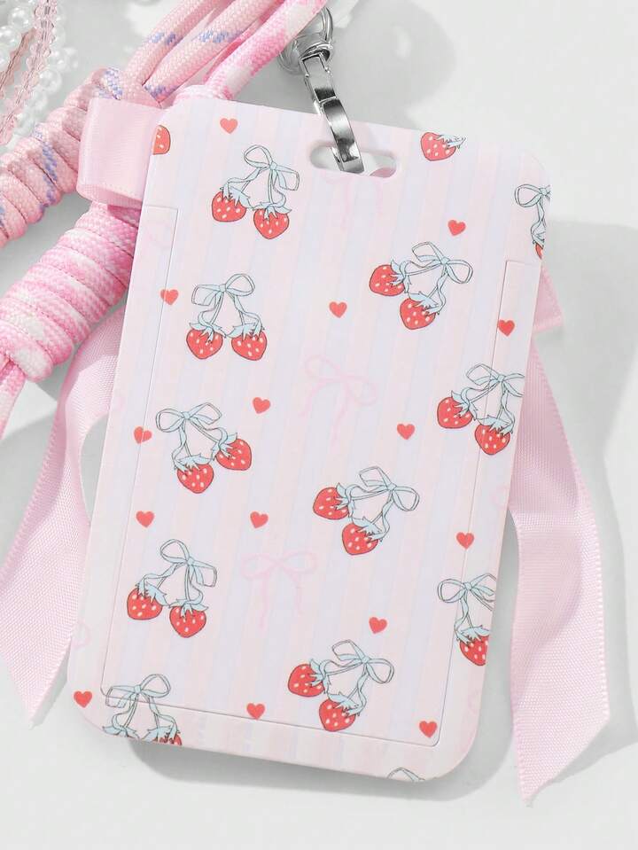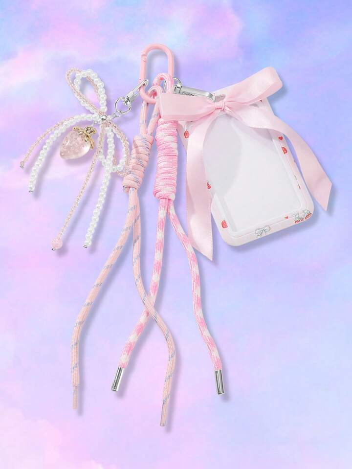 Kawaii 1pc Handmade Beaded Sweet Girl Versatile High-Quality White Faux Pearl Imitation Crystal Ribbon Bow Resin Artificial Strawberry Card Holder With Strawberry Gradient Woven Cord DIY Keychain Bag Pendant, Suitable For Women Daily Wear, Holiday Gift