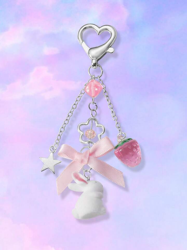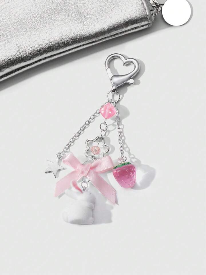 Kawaii 1pc INS Cute & Fashion Combination Pendant Charms With Sequin Star, Strawberry, Dice, Flower, Pink Ribbon, White Flocked Bow Tie Rabbit, Heart, Keychain For Women, Daily Wear And Holiday Gift