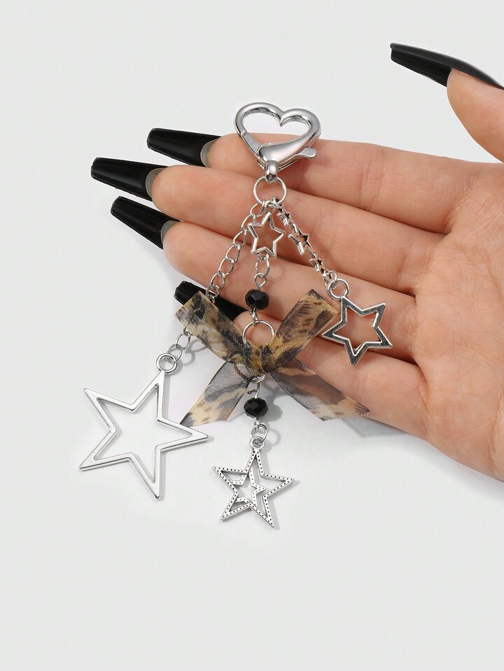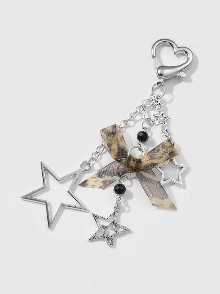 Kawaii 1pc Ins Style Minimalist Silver Hollow Star Chain, Leopard Print Lace Bow & Heart Shaped Keychain, Versatile Accessory For Women, Perfect For Daily Wear And Gift