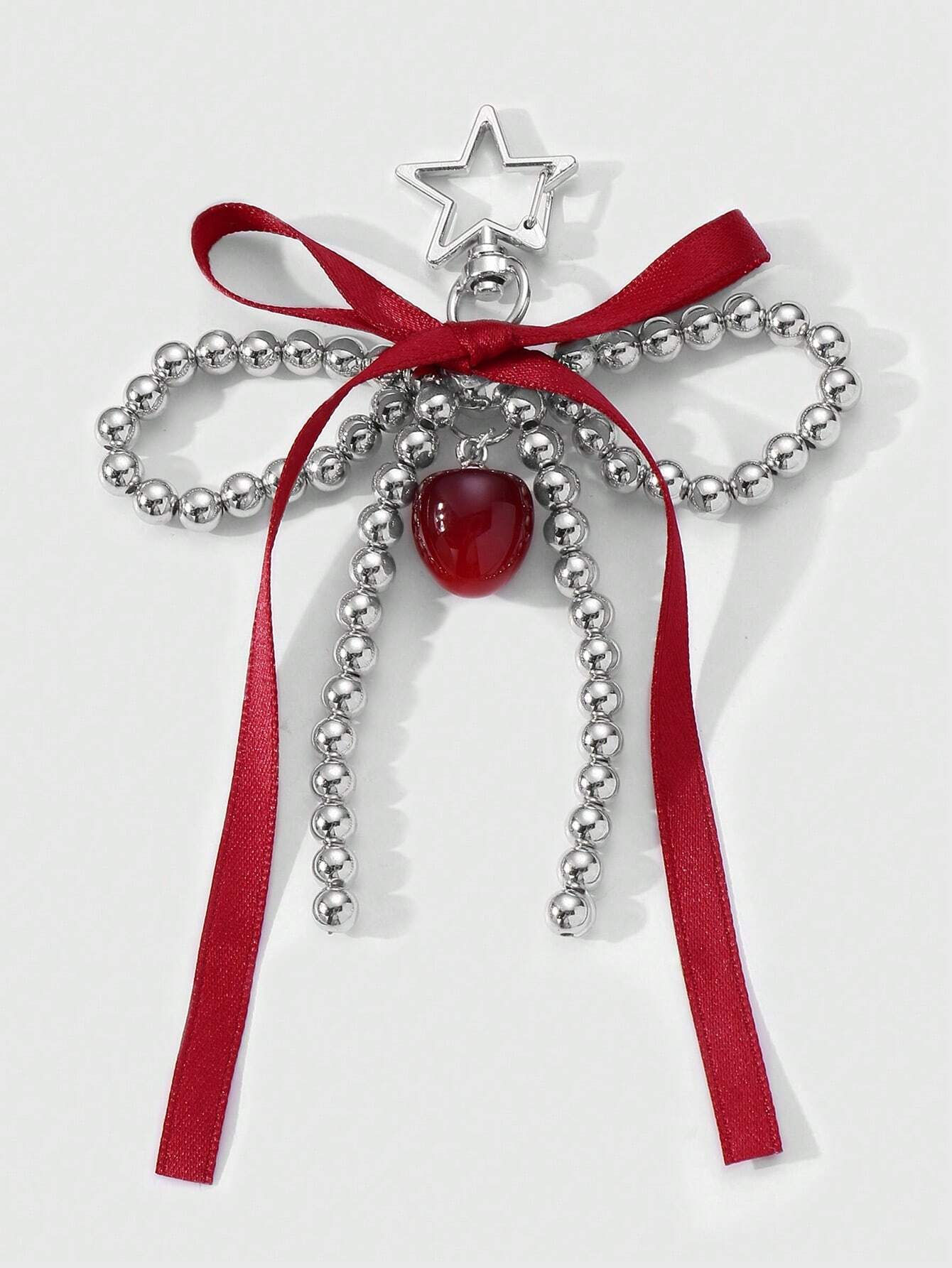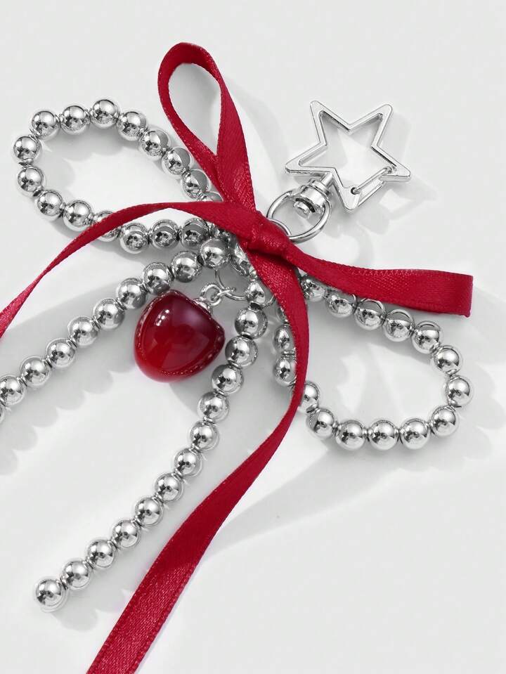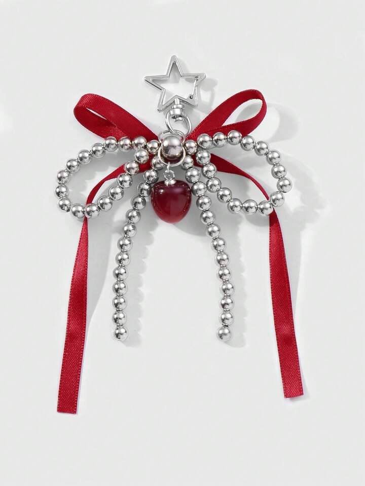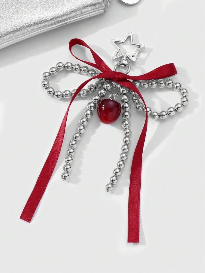 Kawaii 1pc Korean Cute & Fashionable High-End Handmade Beaded Silver CCB Red Ribbon Bow Butterfly Cherry Pendant Star Keychain Bag Charm, Suitable For Girls And Women Daily Wear Or Holiday Gift