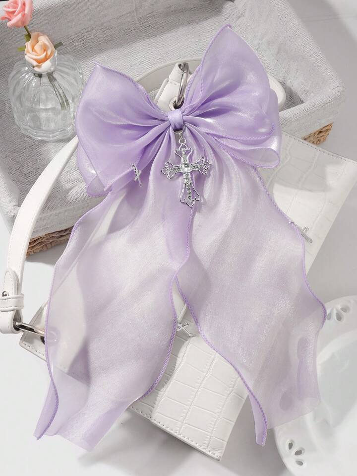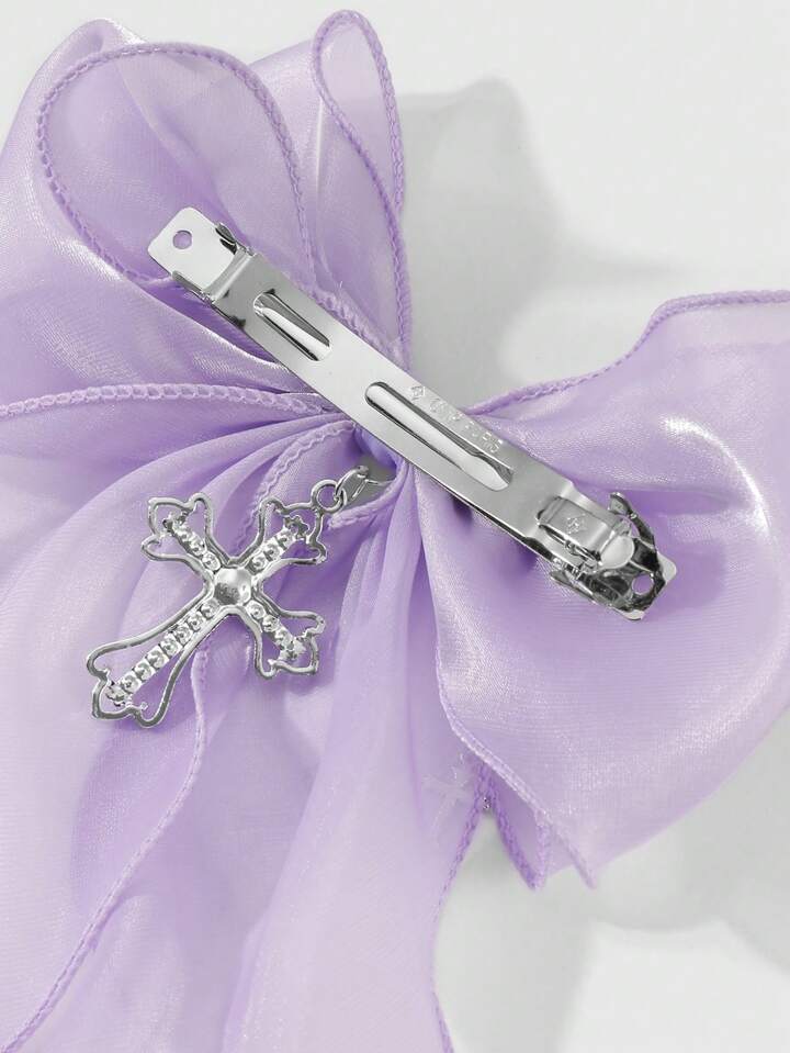 Kawaii 1pc Korean Fashion Elegant Luxury Purple Mesh Dual-Layer Bowknot Rhinestone Cross Pendant Hair Clip Spring Jaw Clip, Suitable For Women & Girls Daily Wear, Festival Gift