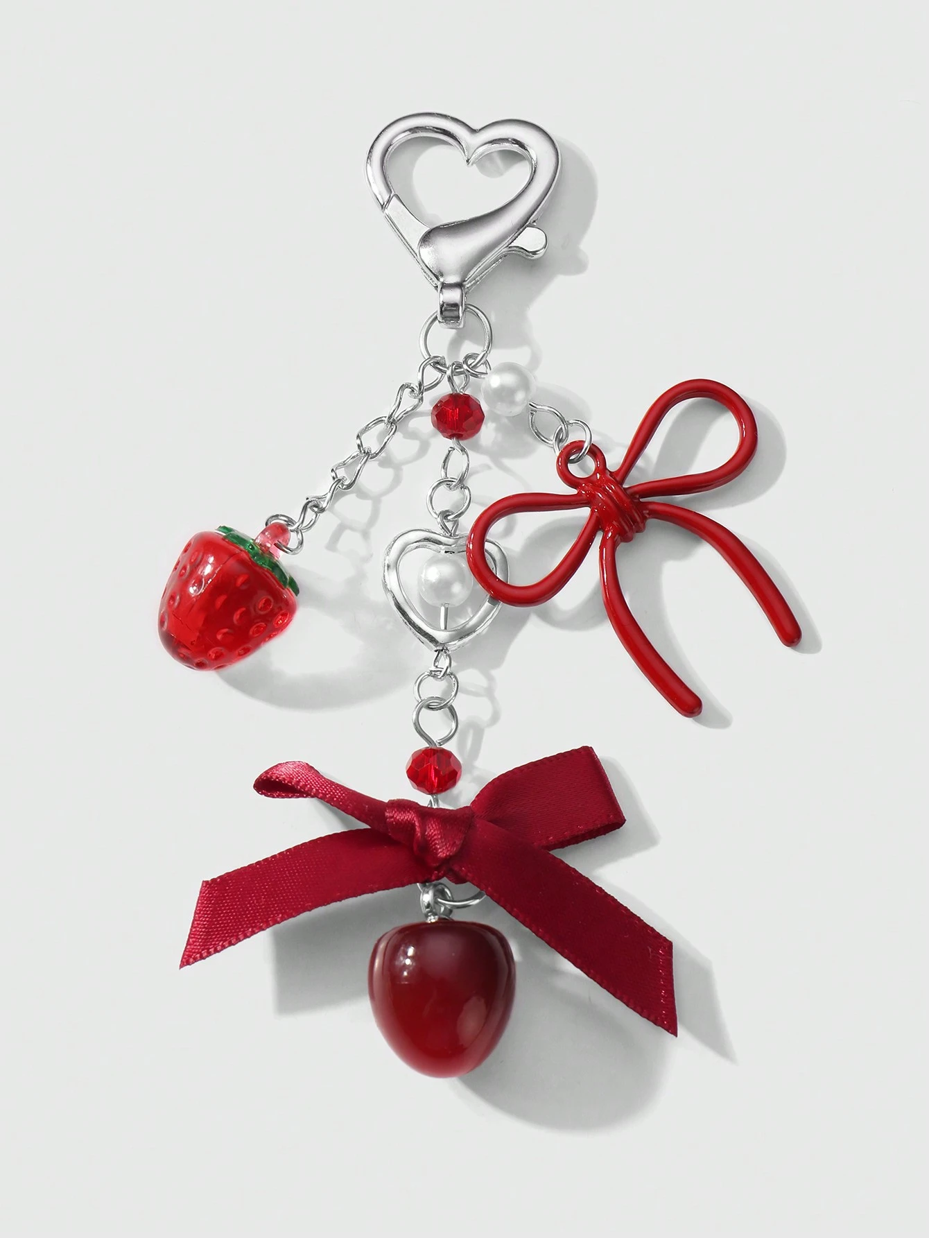 Kawaii 1pc Korean Style Elegant & Chic Silver Chain Ribbon Acrylic Bowknot Resin Strawberry/Cherry Pendant Keychain, Fashionable Accessory Gift For Women & Girls, Daily Wear