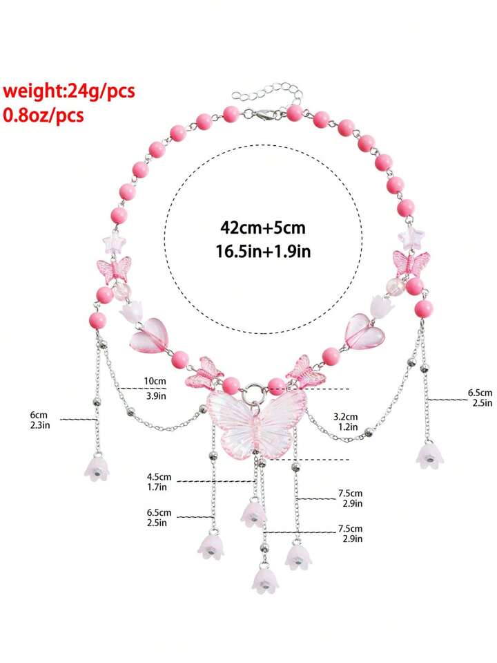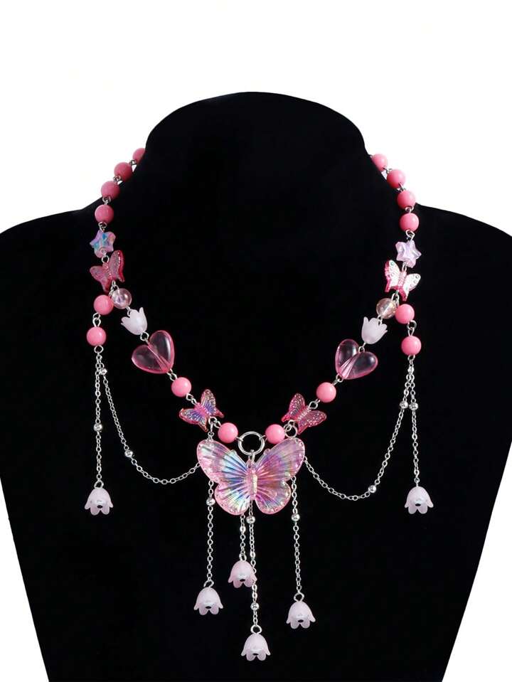 Kawaii 1pc Ladies' Glamorous Pink Beaded Heart & Faux Pearl Butterfly Pendant Necklace Valentines,Mom,Mother,Mother's Day,Gift