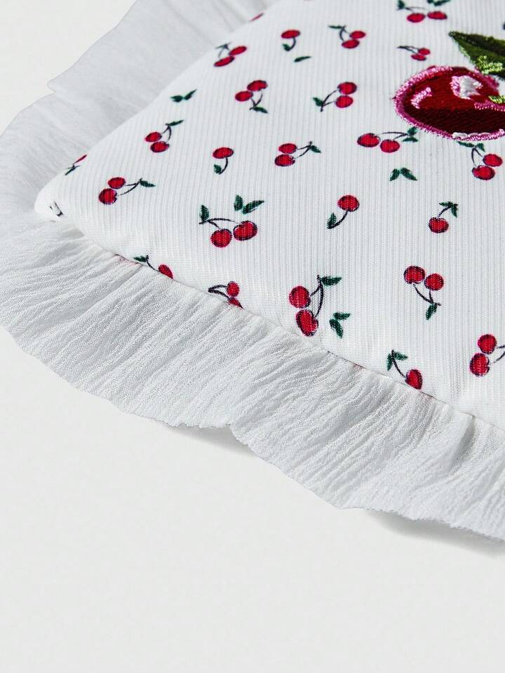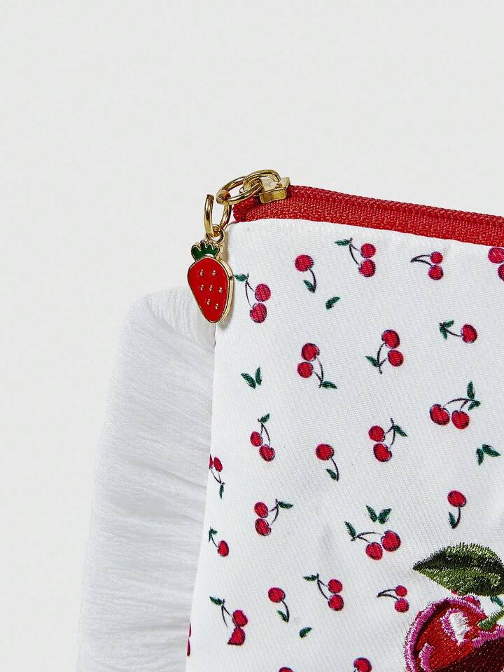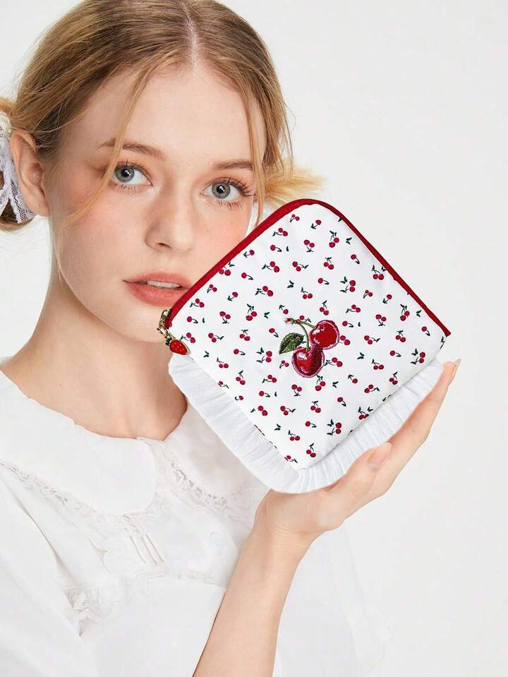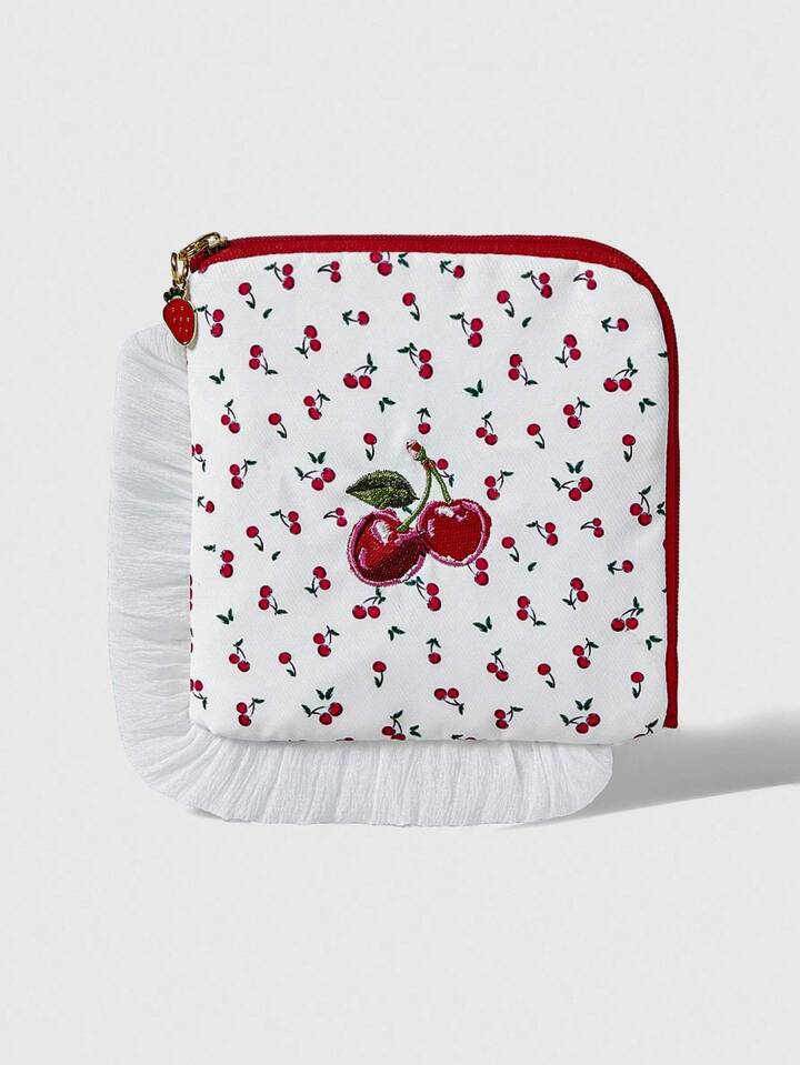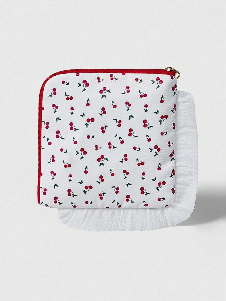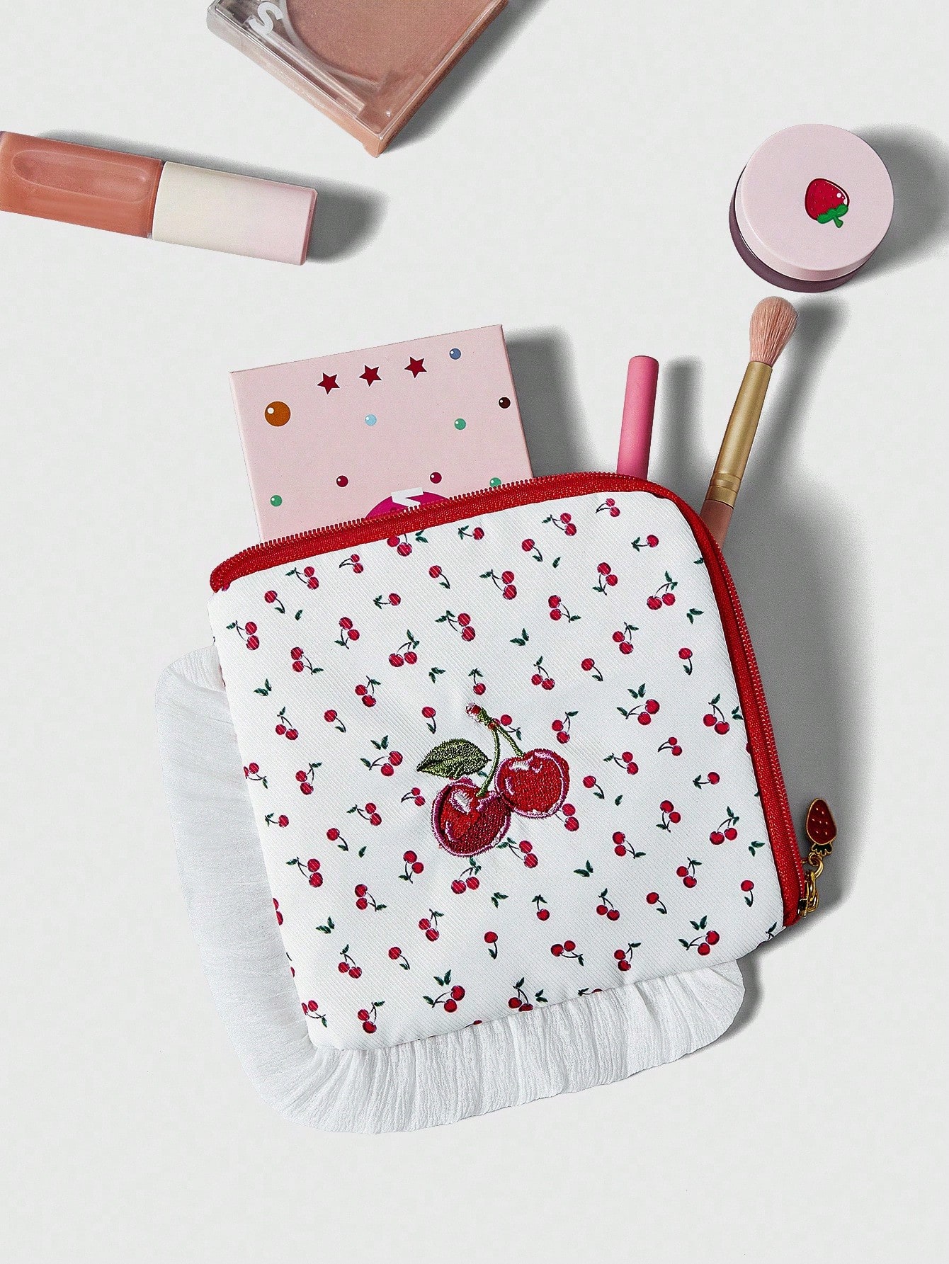 Kawaii 1pc Large Capacity Portable Makeup Bag With Fashionable All-Over Cherry Pattern And Square Lace Trim, 15x15cm