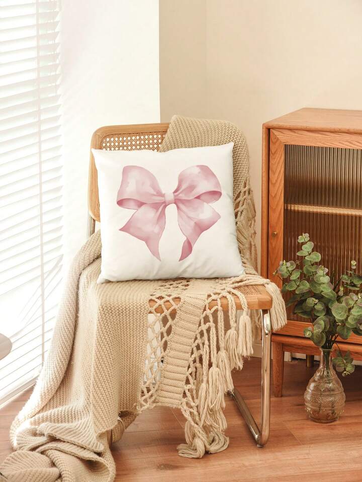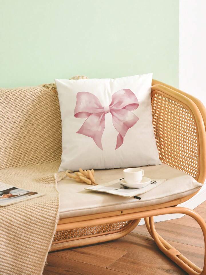 Kawaii 1pc Pink Bow Pattern Pillow Cover, Plush Printed Square Pillow Case For Living Room, Bedroom, Home Decor, Sofa/Car Lumbar Cushion, Suitable For All Seasons