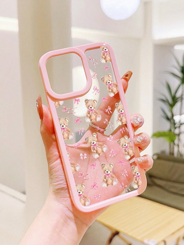 Kawaii 1pc Pink Bow Teddy Bear Pattern IPhone 11/12/13/14/15 Pro Max Phone Case