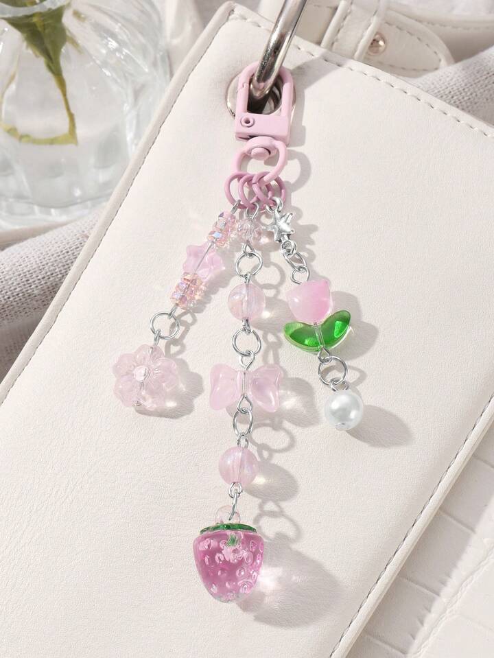 Kawaii 1pc Refined & Cute Girl Minimalist Academic Style Silver Chain Faux Pearl & Crystal Round Ball Stars Strawberry Bow Cartoon Phone Pendant Keychain Bag Charm, Suitable For Women, Daily Wear, Holiday Gift Valentines