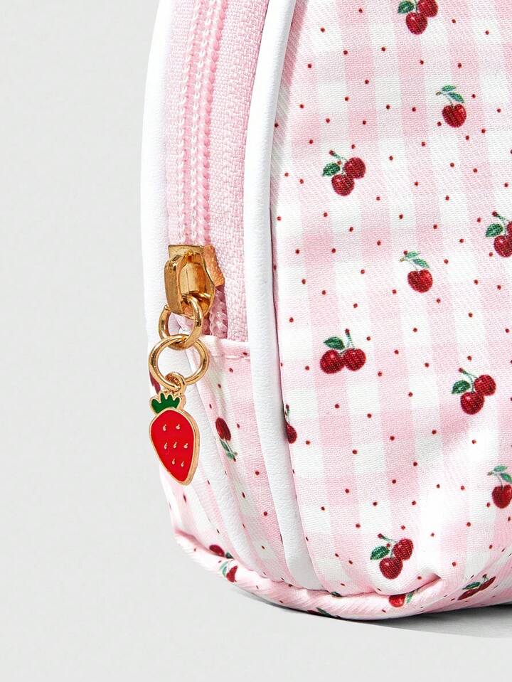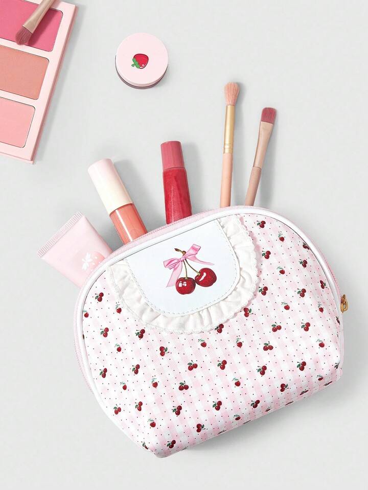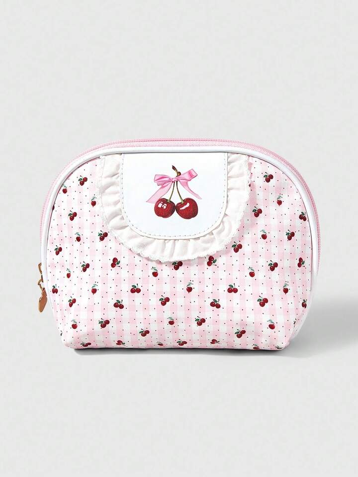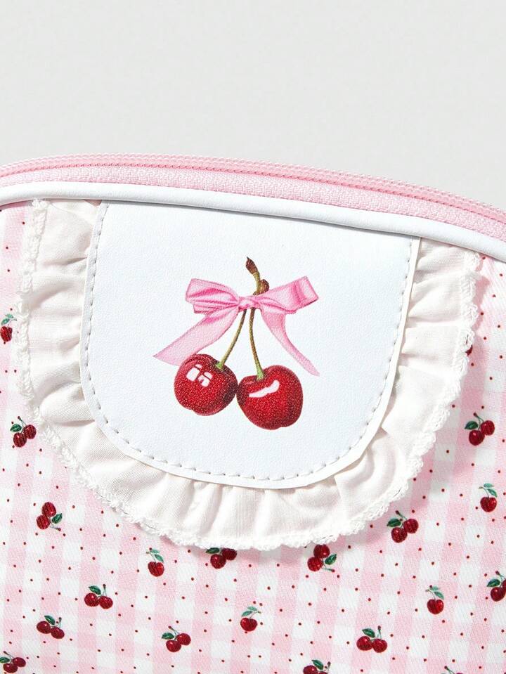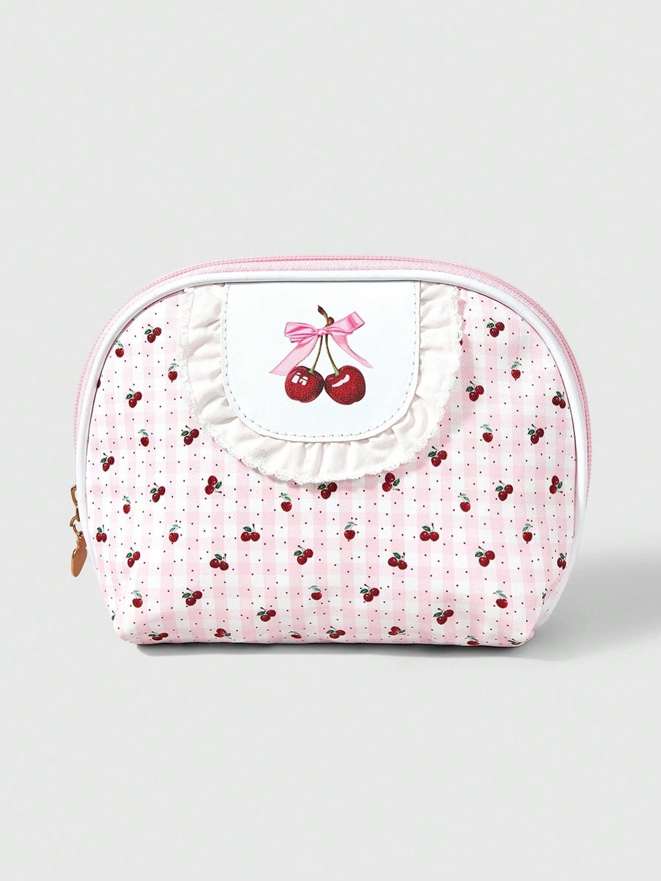 Kawaii 1pc White Lace & Polka Dot Cherry Pattern Large Capacity Portable Semicircle Cosmetic Bag